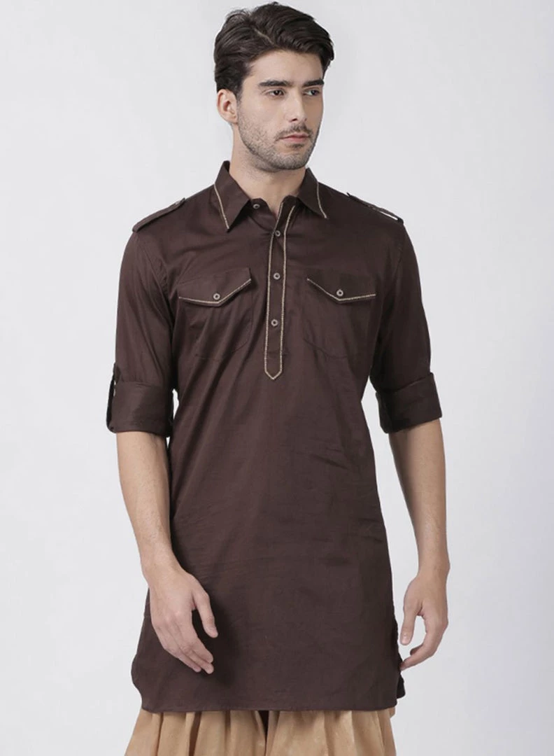Brown straight above knee length pathani kurta, has a shirt collar, long sleeves, button placket, curved hem, two pockets and side slits
