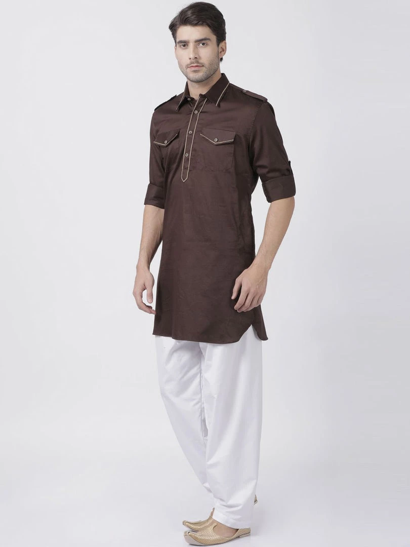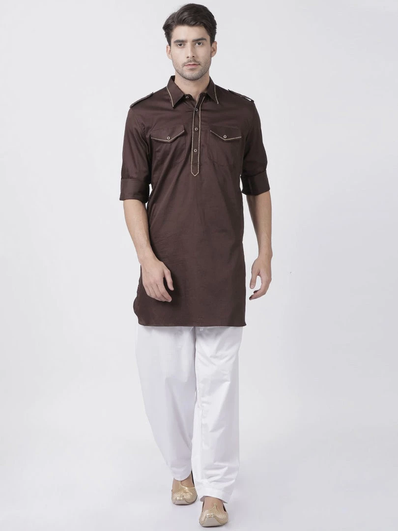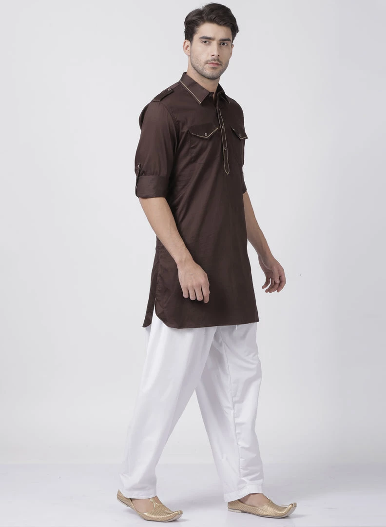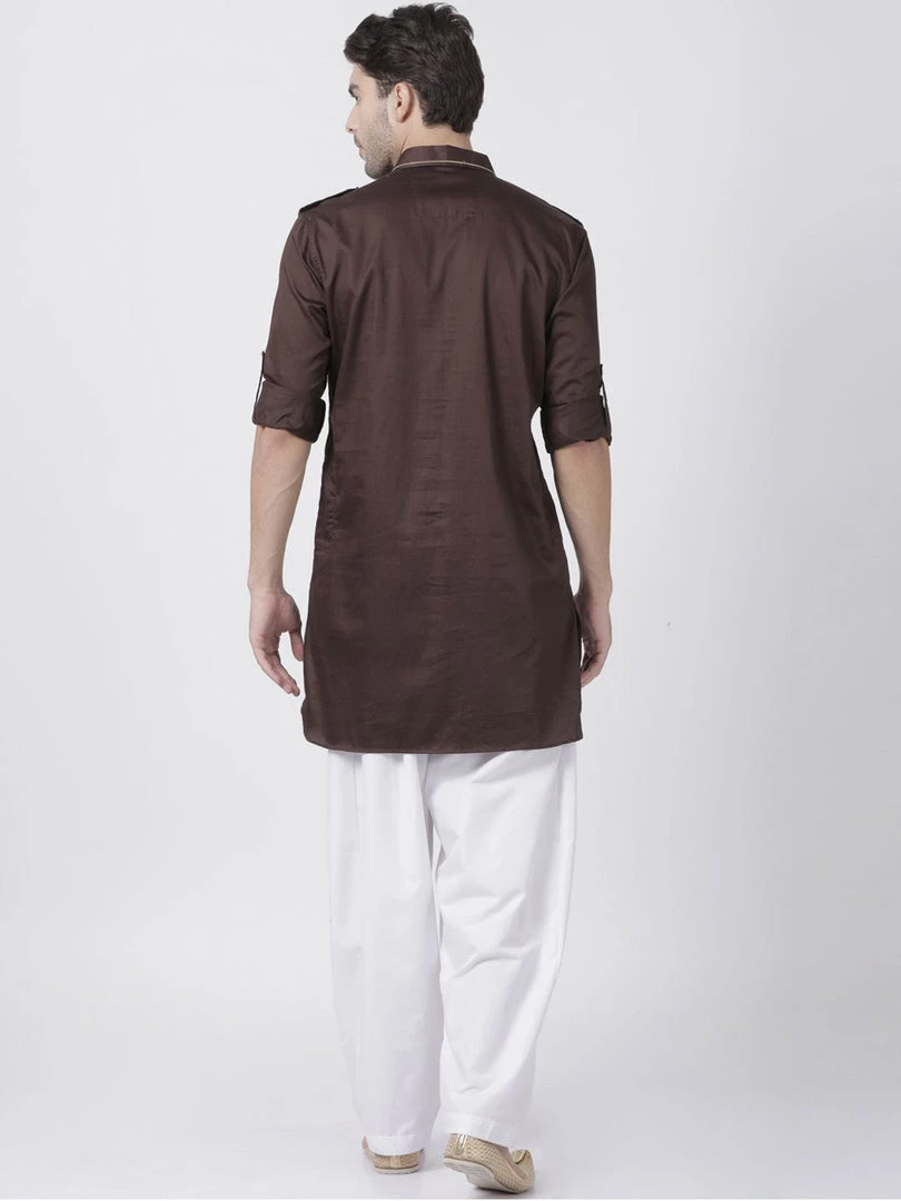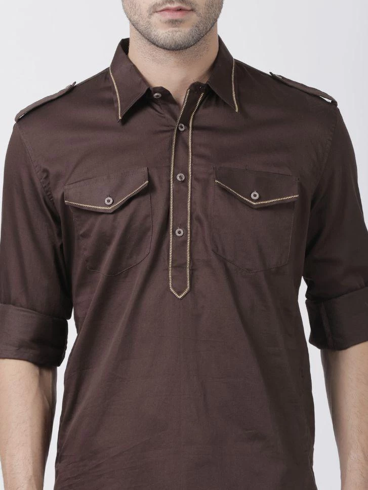 Brown solid straight above knee length kurta, has a shirt collar, button placket, long sleeves, two pockets and curved hem