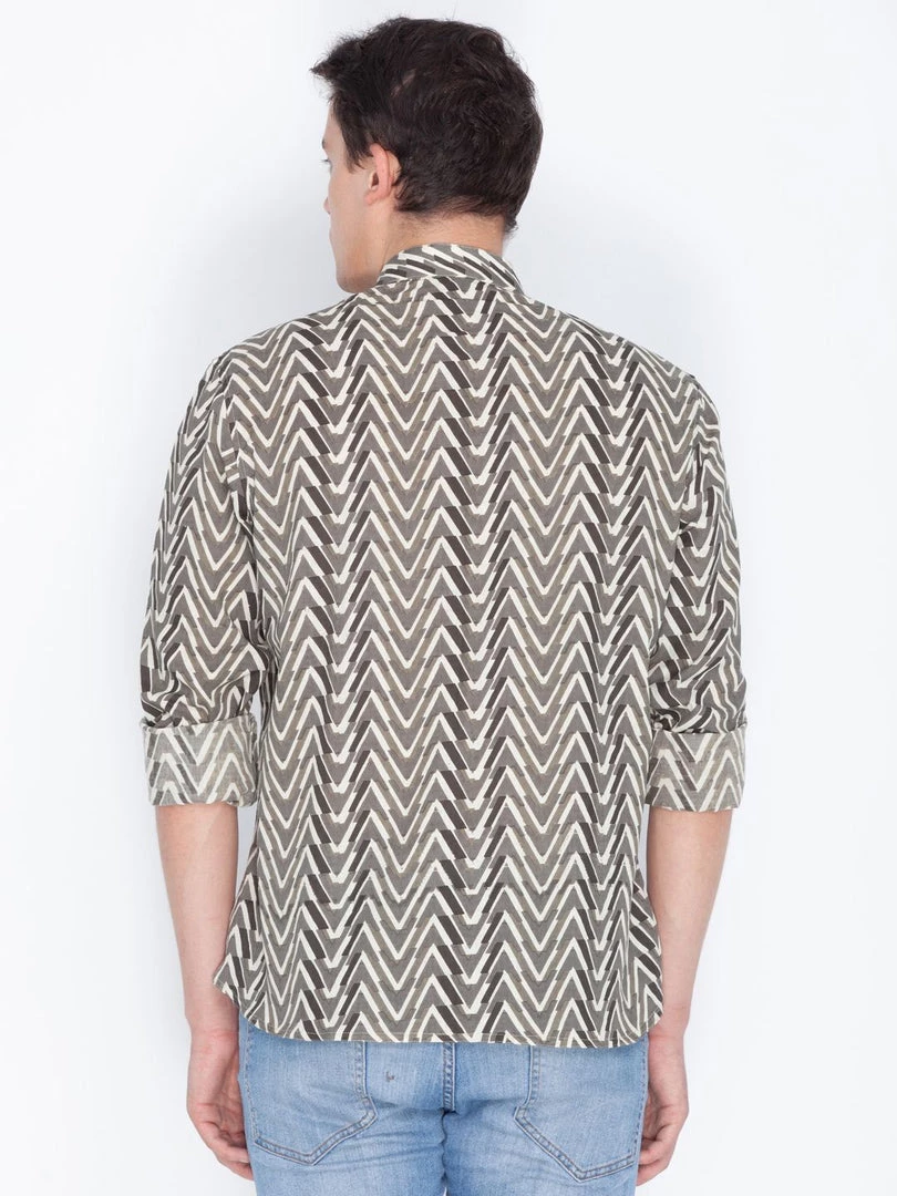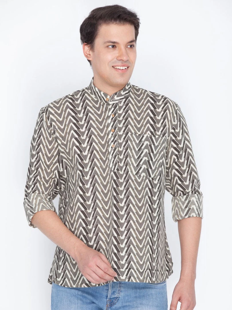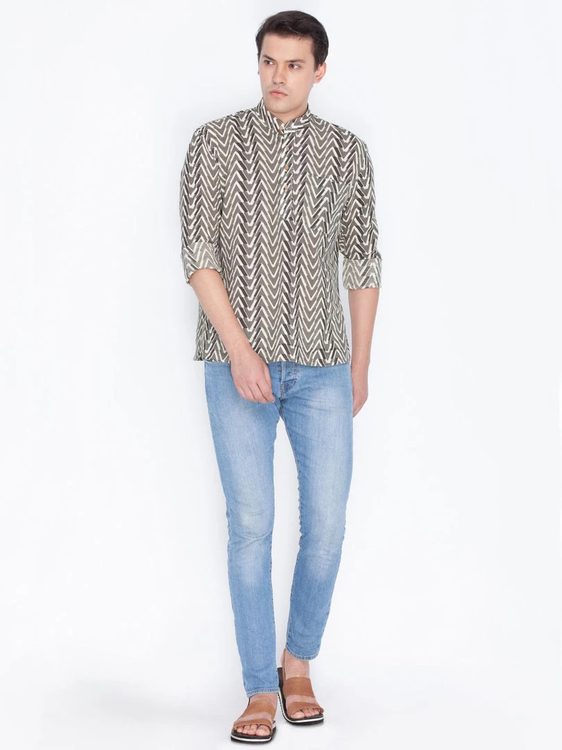 Grey printed kurta, has a mandarin collar, long sleeves, straight hem, button placket and a pocket