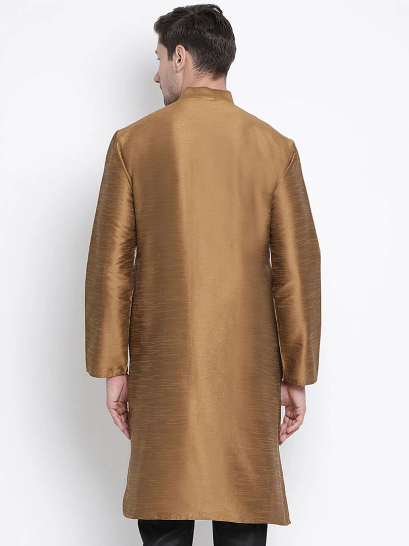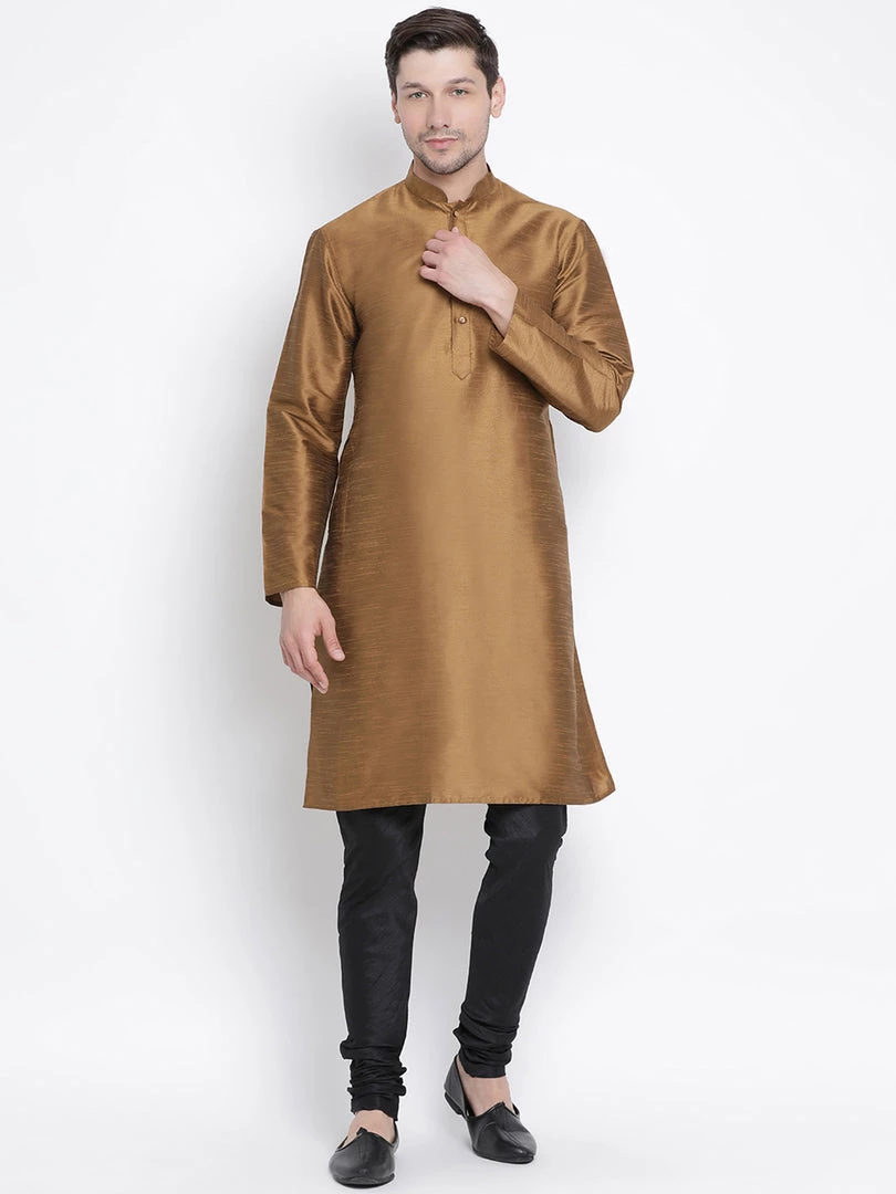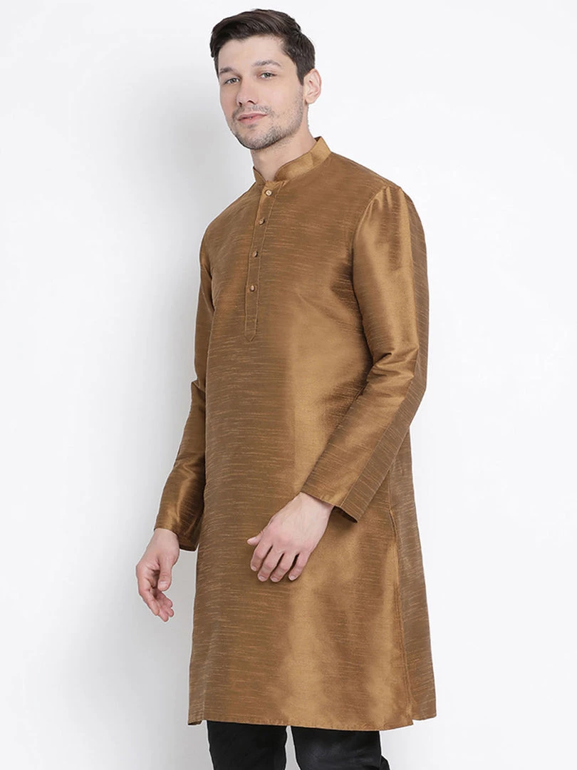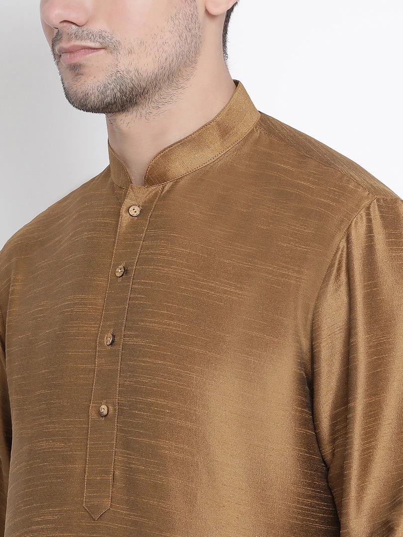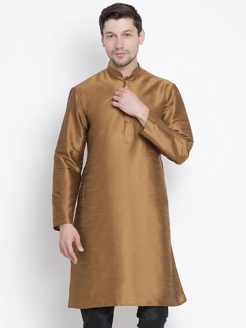 Brown solid straight kurta, has a mandarin collar, long sleeves, button placket, straight hem, and side slits.
