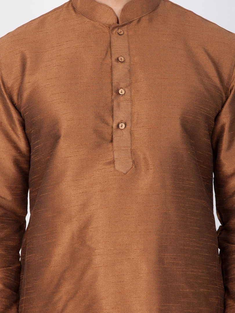 Brown solid straight knee length kurta, has a mandarin collar, long sleeves, button placket, straight hem.