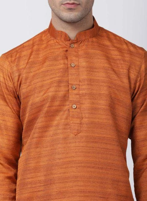 Brown woven straight kurta, has a mandarin collar, long sleeves, button placket, straight hem, and side slits