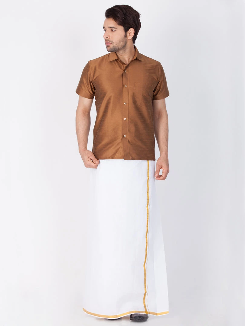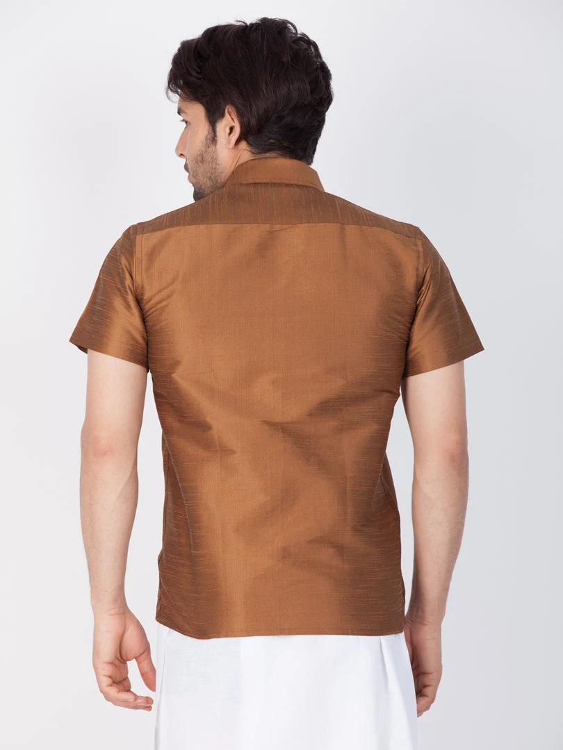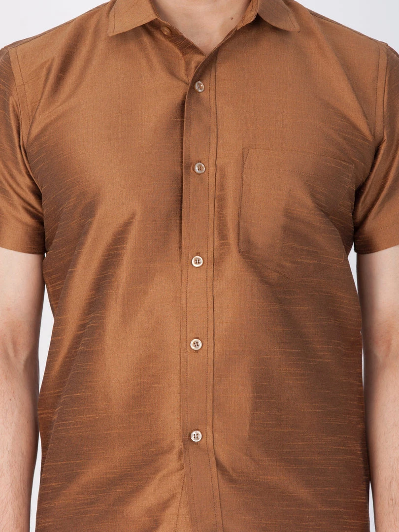 Brown solid casual shirt, has a shirt collar, short sleeves, straight hem, one patch pocket