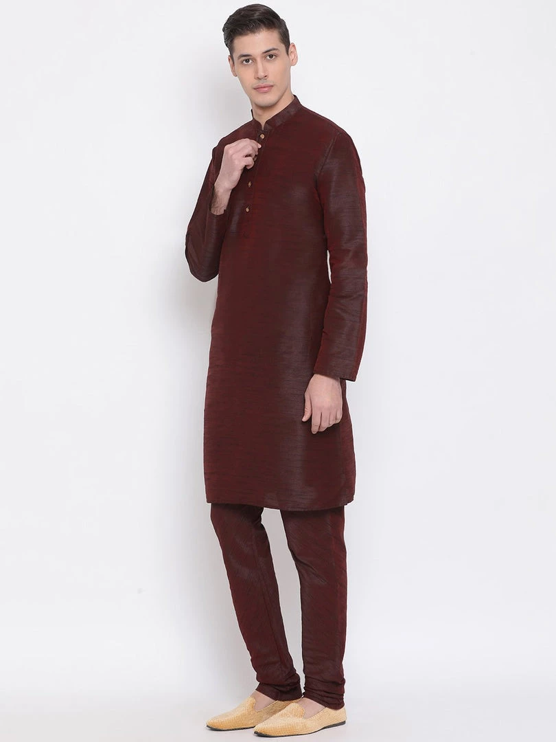Burgundy solid straight knee length kurta, has a mandarin collar, button placket, long sleeves, straight hem