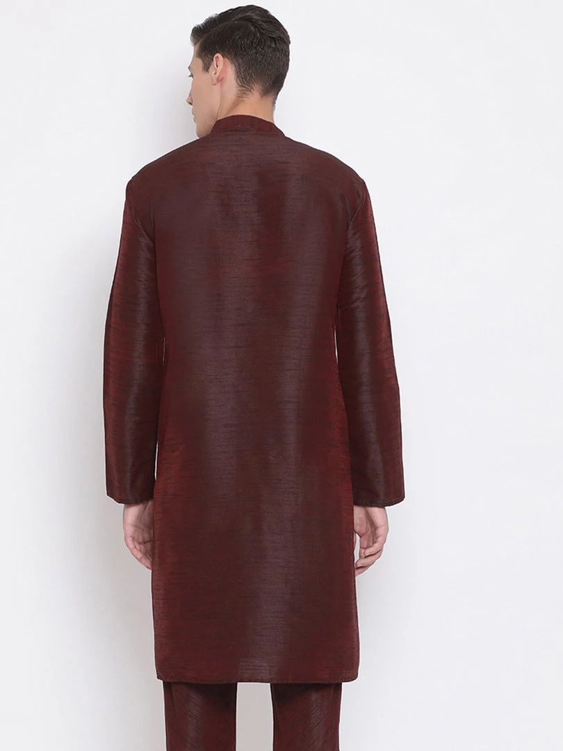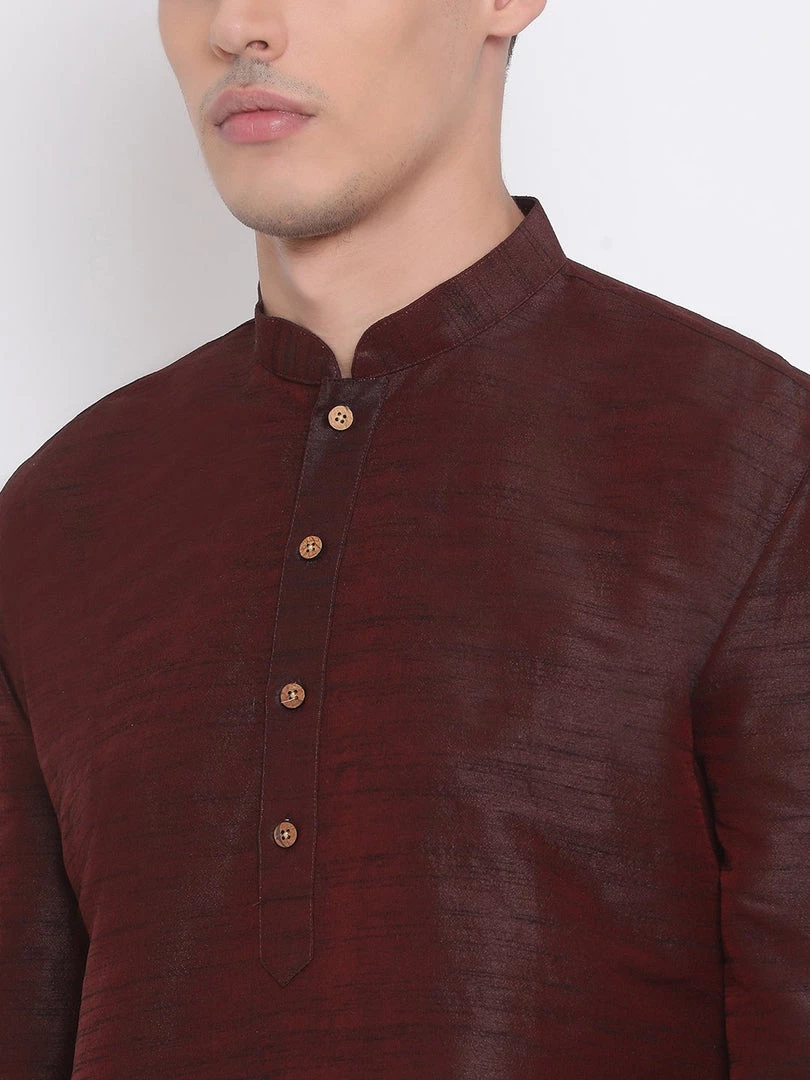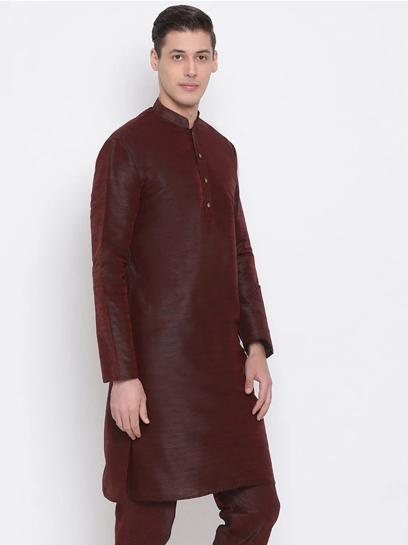 Burgundy solid straight kurta, has a mandarin collar, long sleeves, straight hem, and side slits