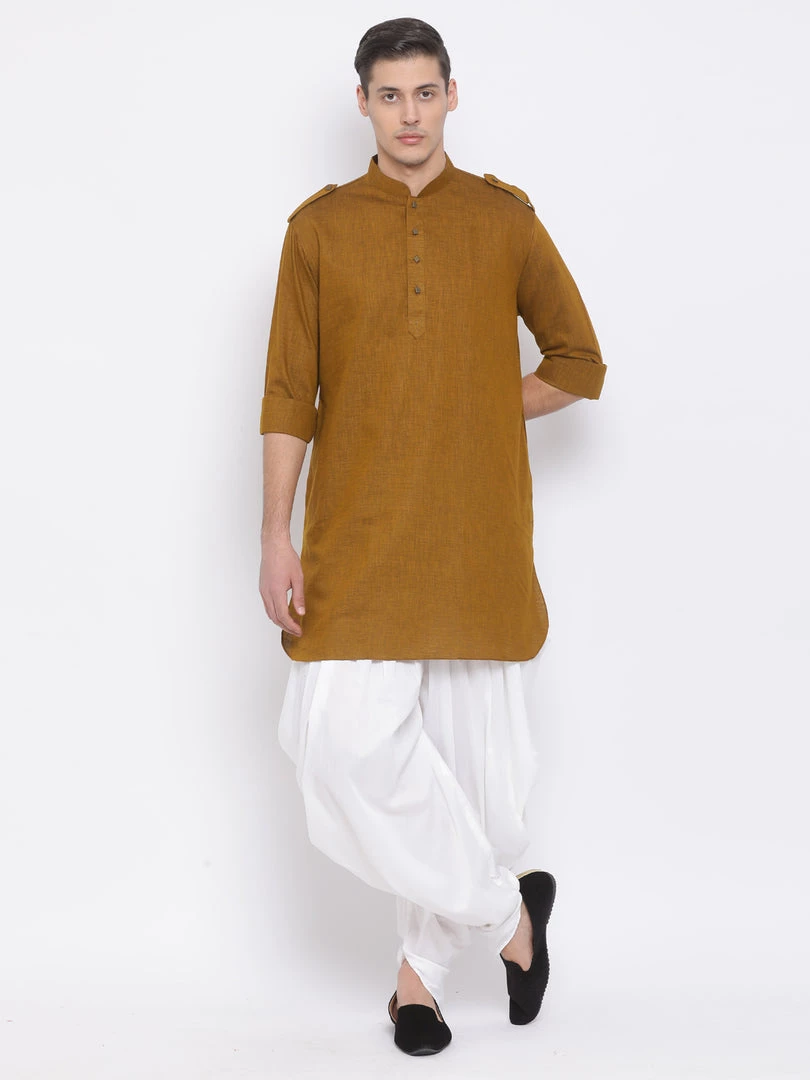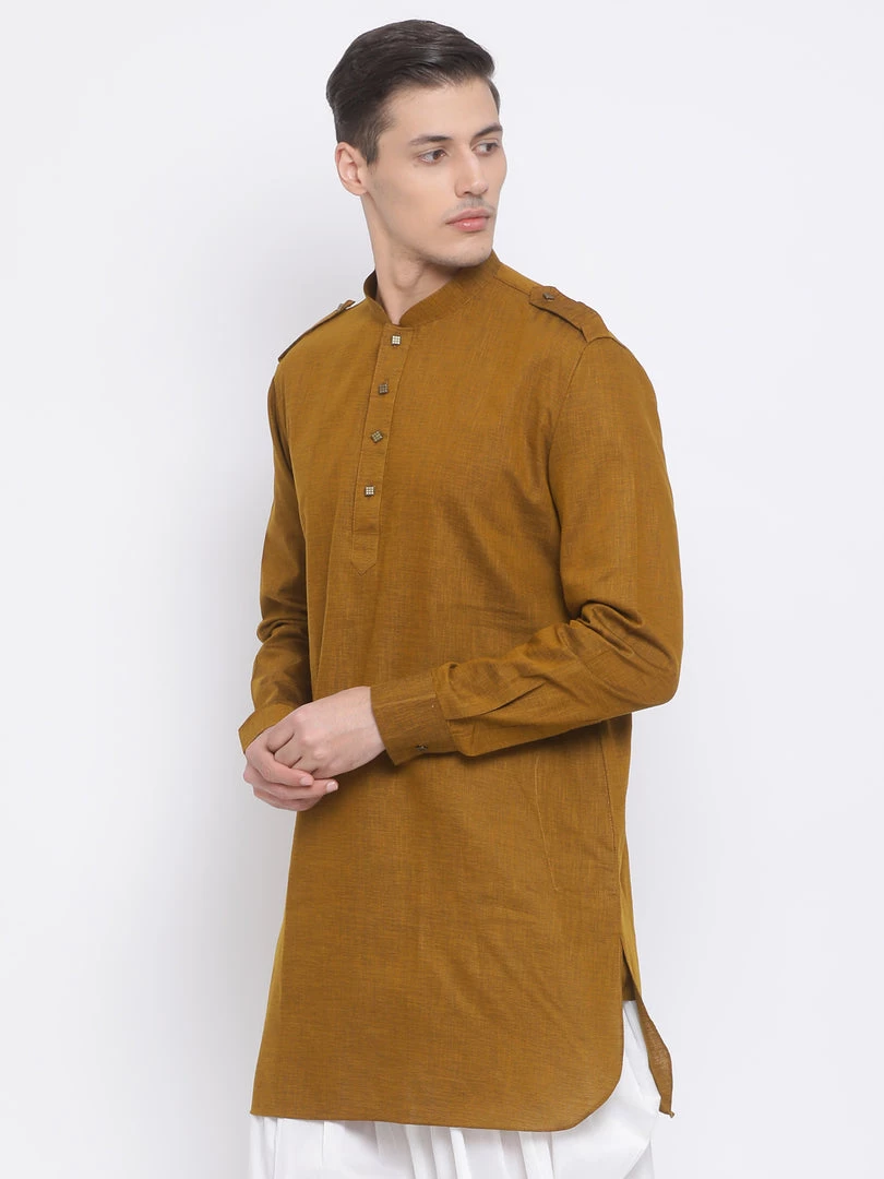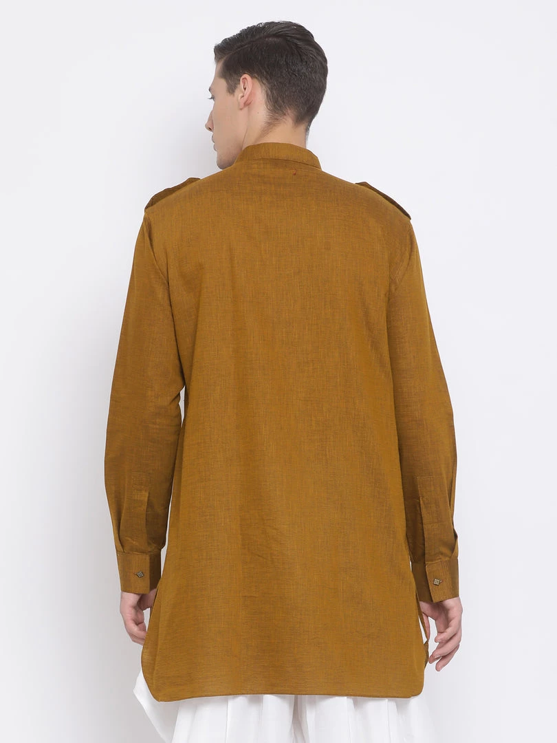 Brown solid above knee length pathani kurta, has a mandarin collar, long sleeves with cuffs, button placket, curved hem, side slits, and a pocket