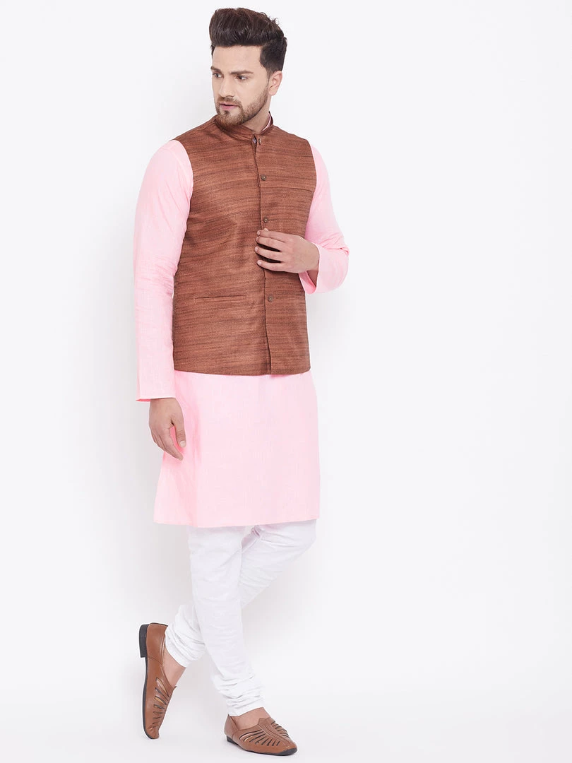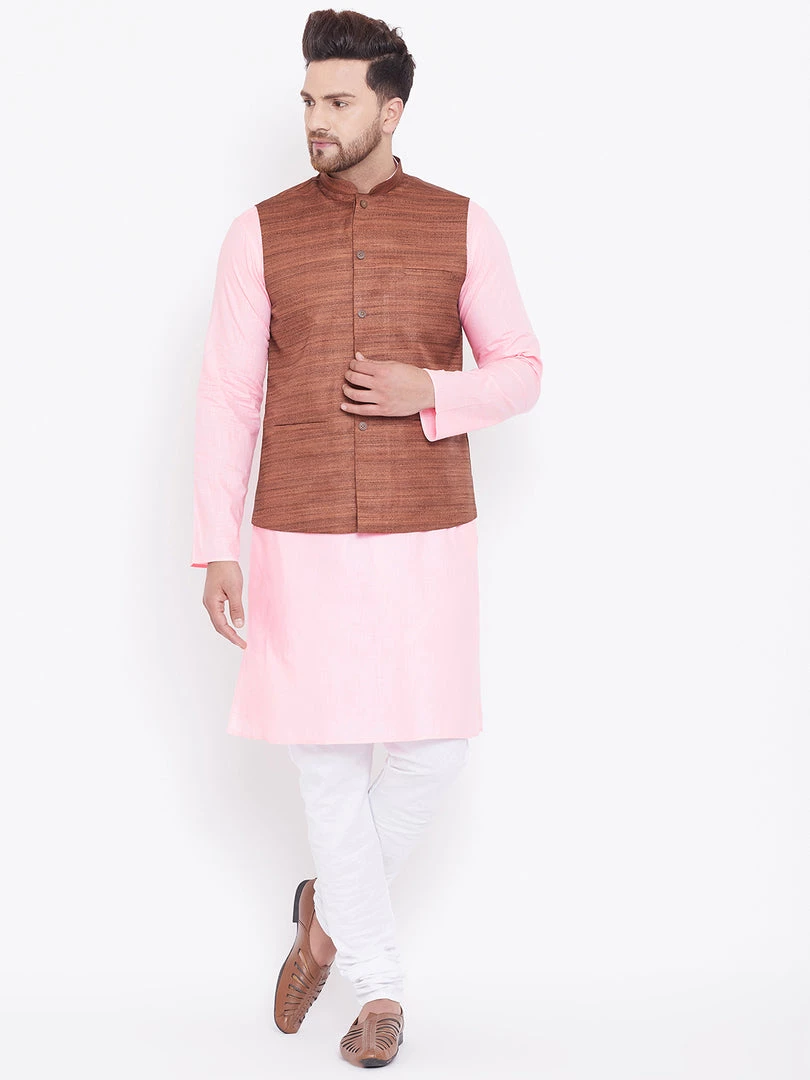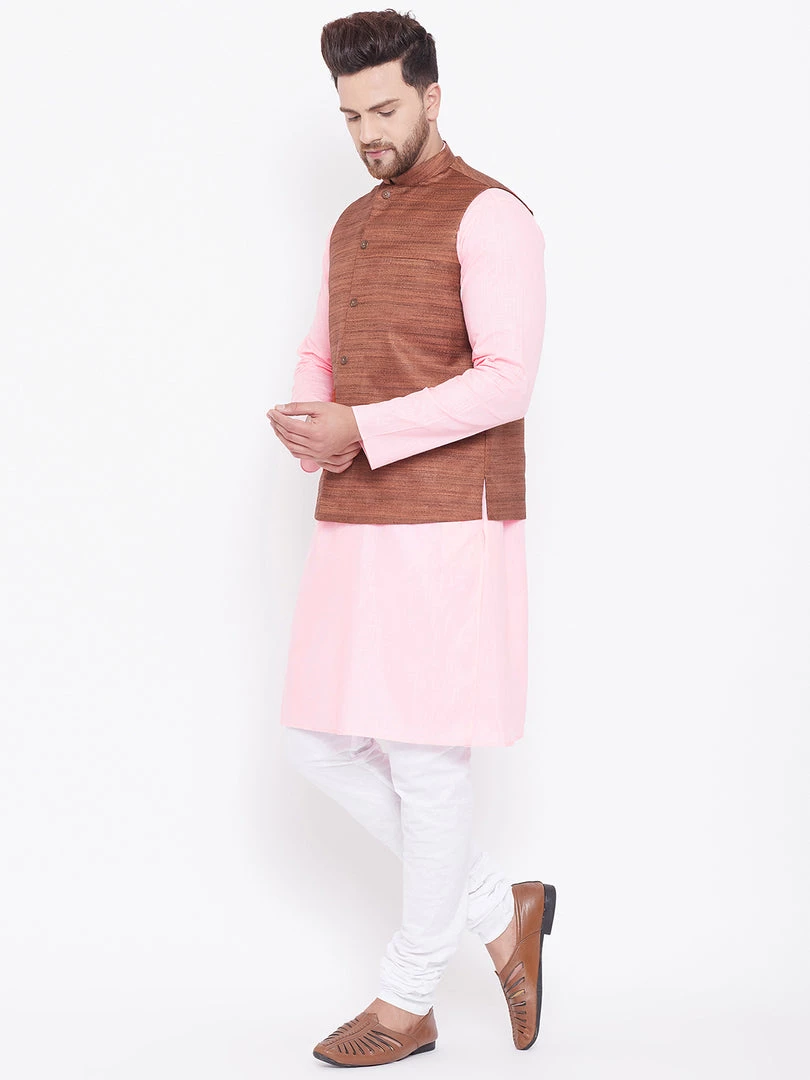 Pink solid kurta with solid churidar and coffee brown Nehru jacket
