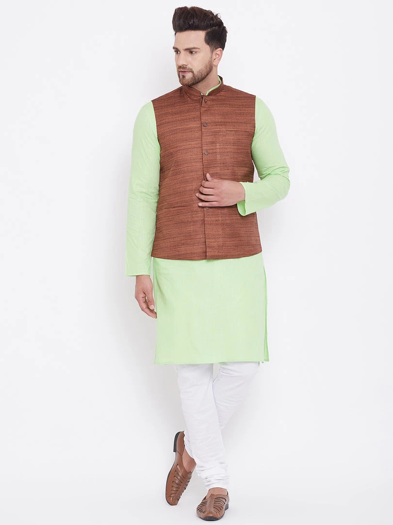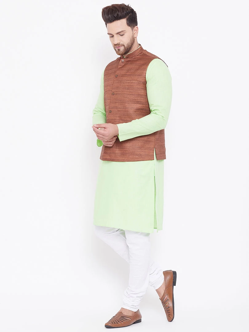Mint green solid kurta with solid churidar and coffee brown Nehru jacket