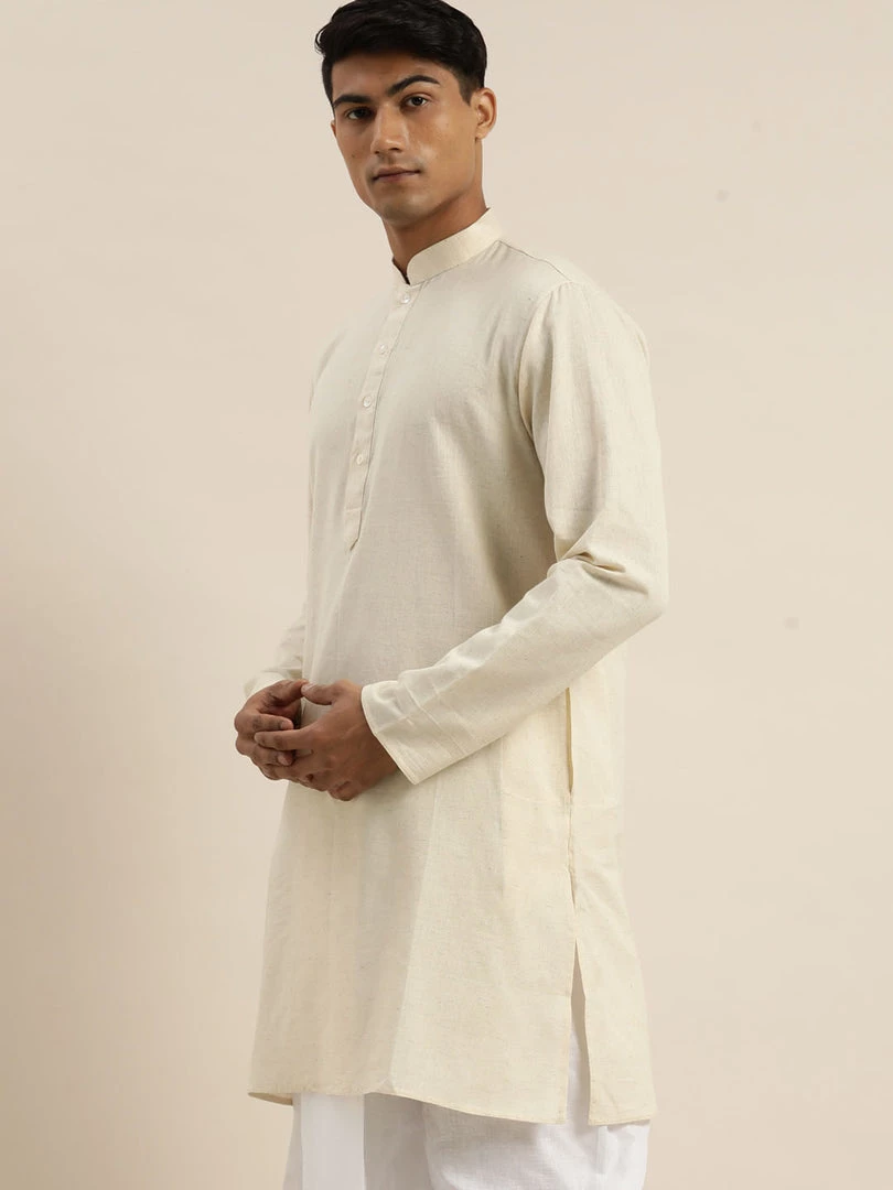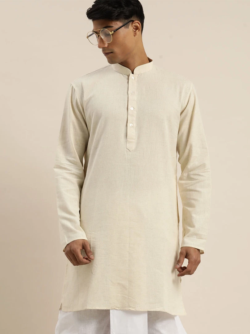 Cream solid men’s kurta, straight shape, regular style, mandarin collar, long regular sleeves, 2 pockets, knee length with straight hem, pure cotton machine weave fabric.