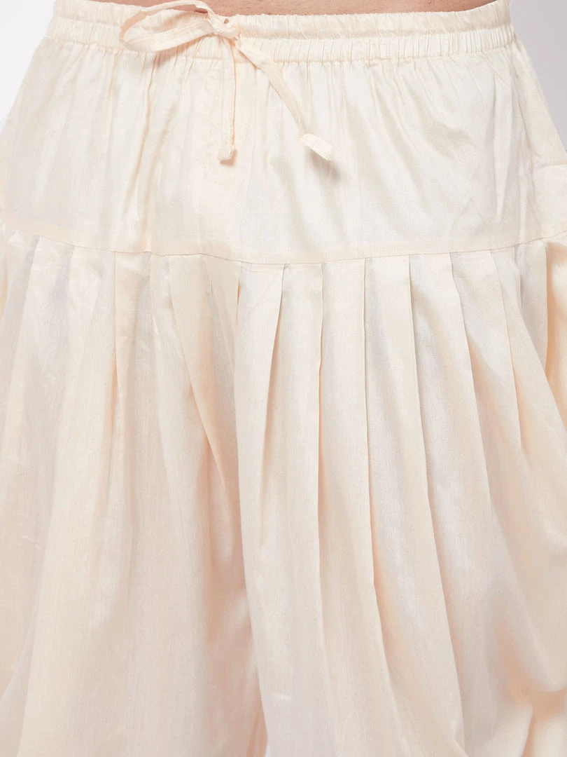 Cream solid ready to wear mid-rise dhoti pants has an elasticated waistband with a drawstring fastening and cowl detailing on the side