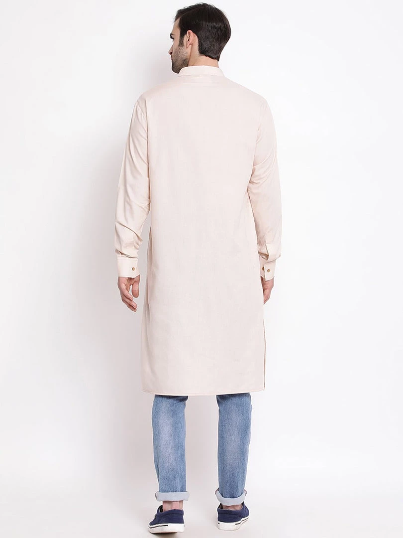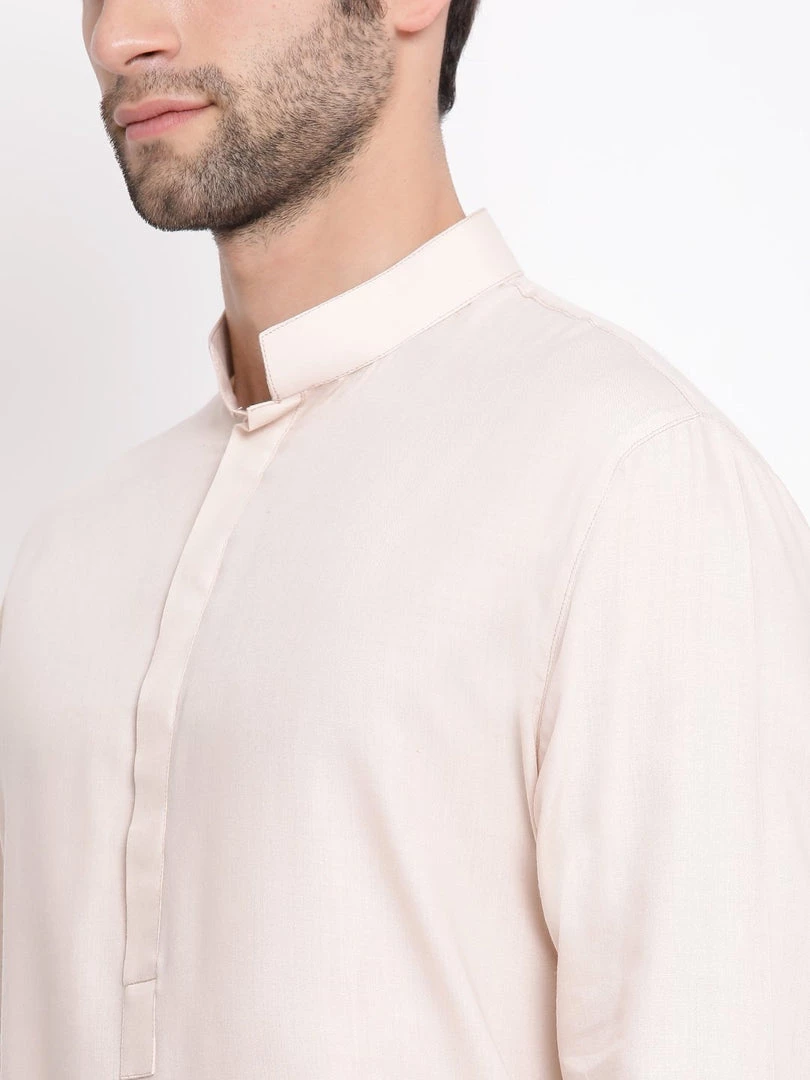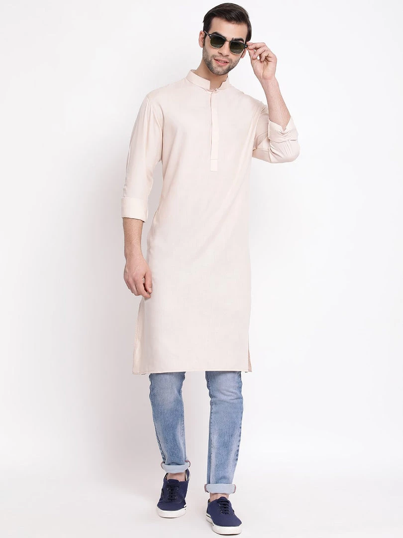 Cream solid straight kurta, has a mandarin collar, long sleeves, button placket, straight hem, and side slits.