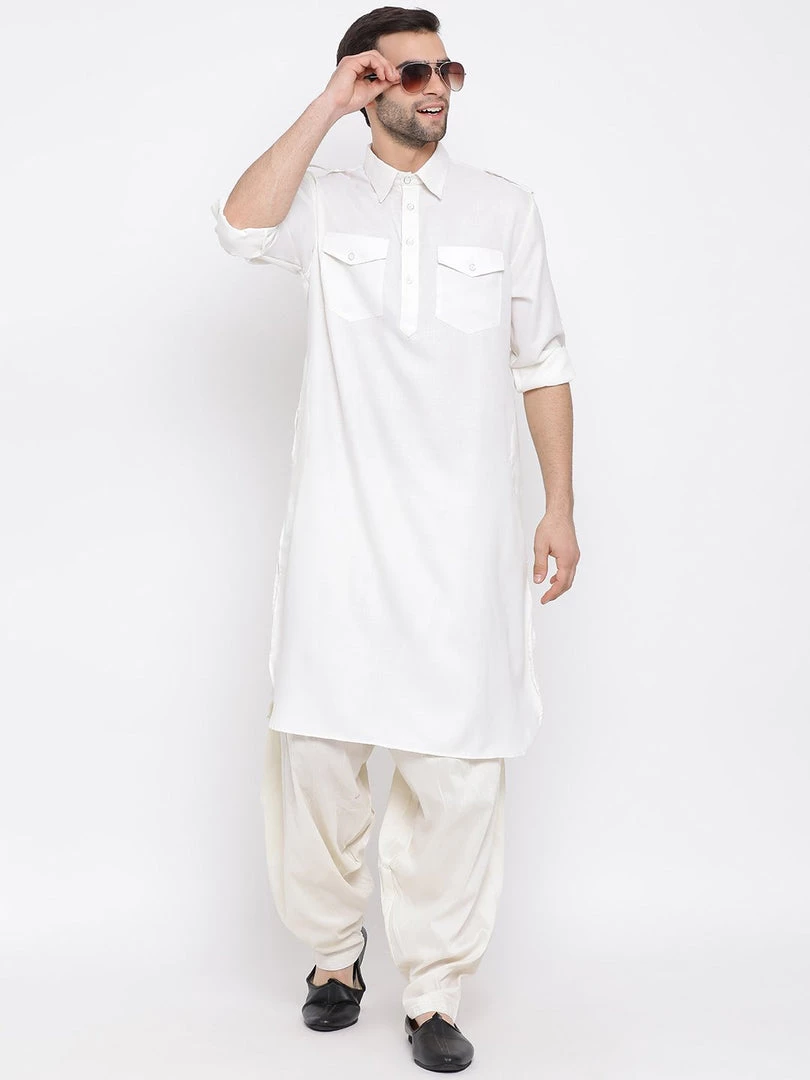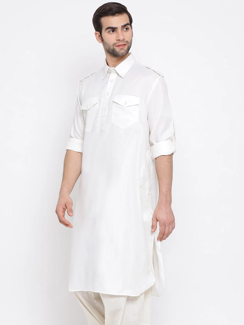 Cream color straight knee length pathani kurta, has a shirt collar, long sleeves, button placket, curved hem, two pockets and side slits