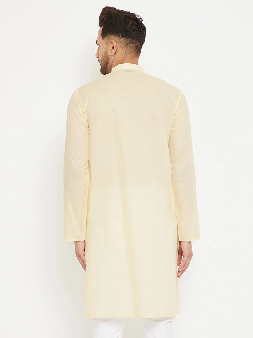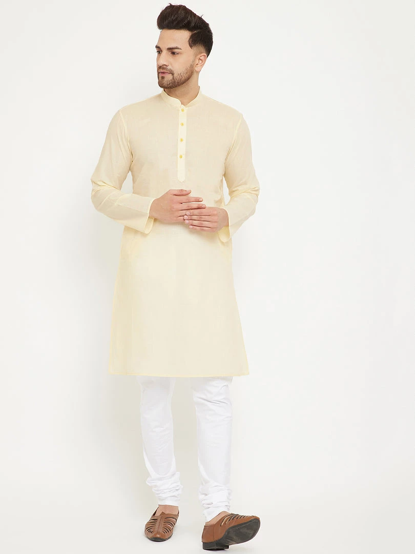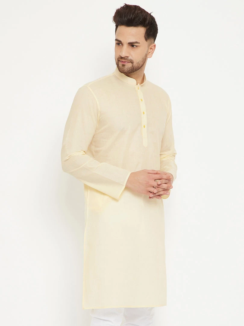Cream Solid straight Knee length kurta, has a Mandarin Collar, button placket, long sleeves, Straight hem, Side slits.