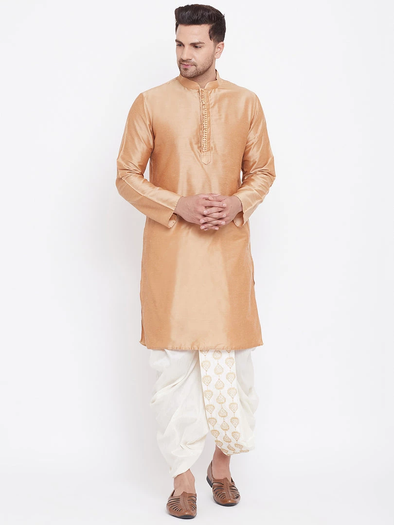 Cream solid mid-rise ready to wear dhoti in a traditional pattern and golden embroidered detailing has a waistband with drawstring closure.