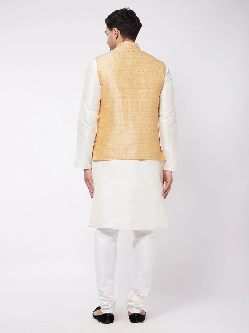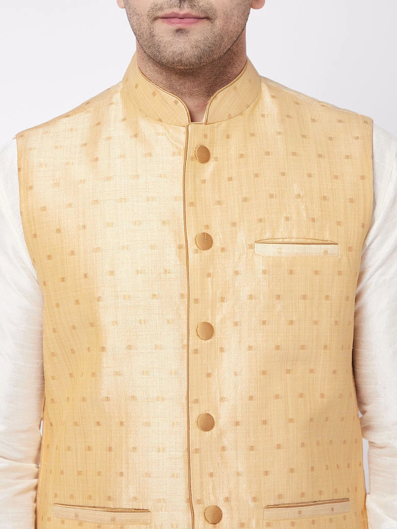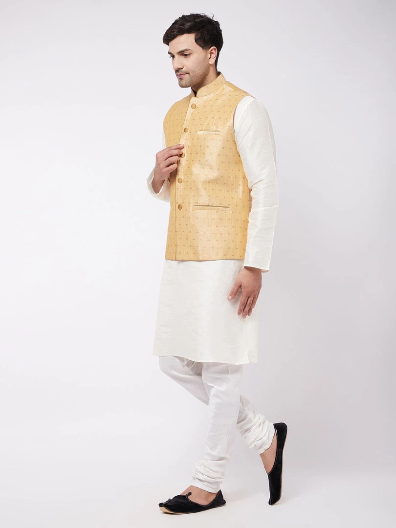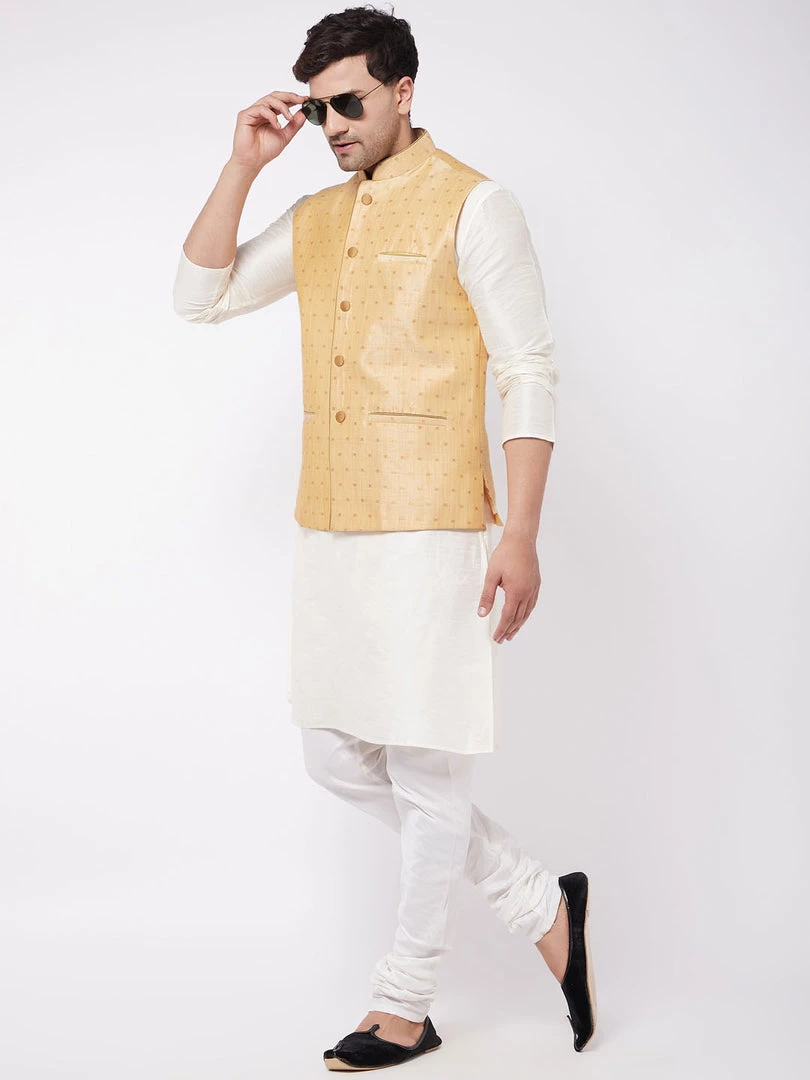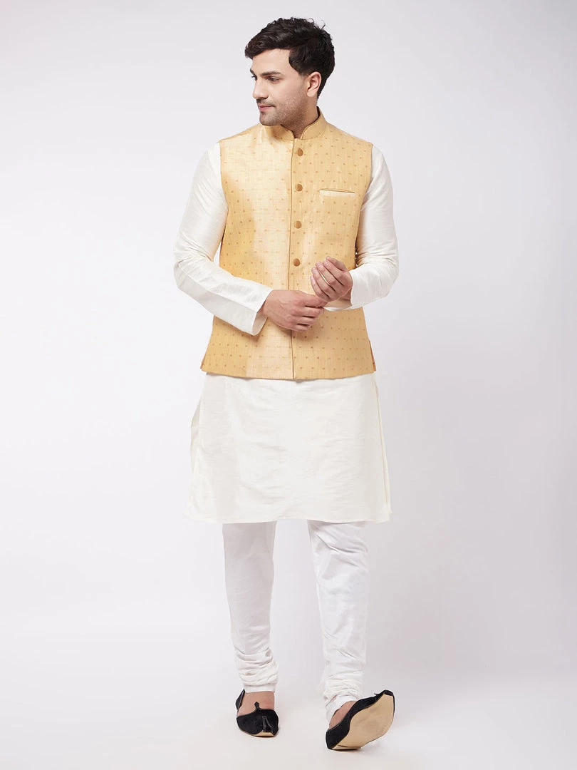 Cream Solid kurta with cream solid Pyjama and gold woven Nehru jacket