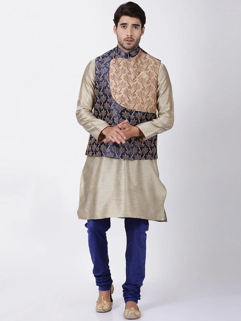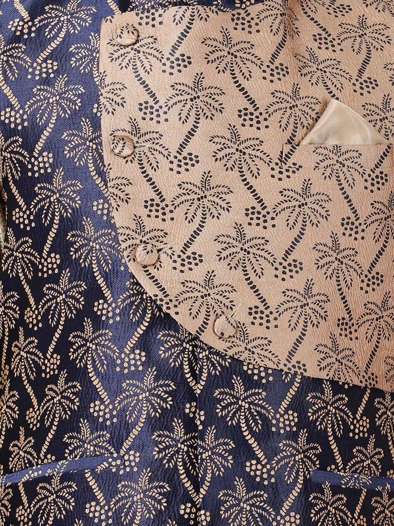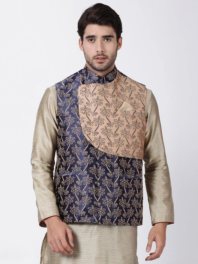 Dark Blue and Beige Solid Nehru jacket, Sleeveless, Straight hem, has a Mandarin Collar, three pockets one with a pocket square.