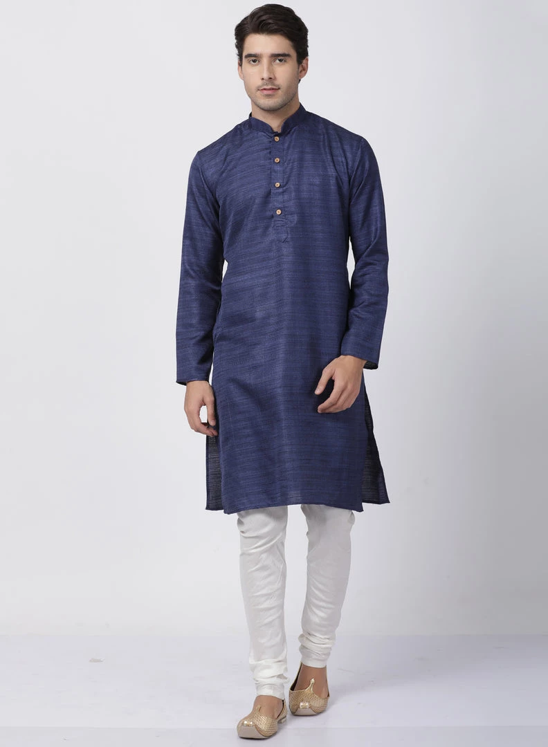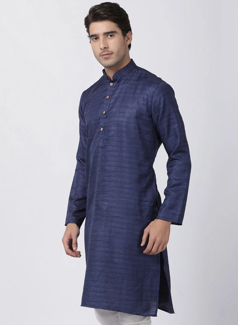 Dark blue woven straight kurta, has a mandarin collar, long sleeves, button placket, straight hem, and side slits