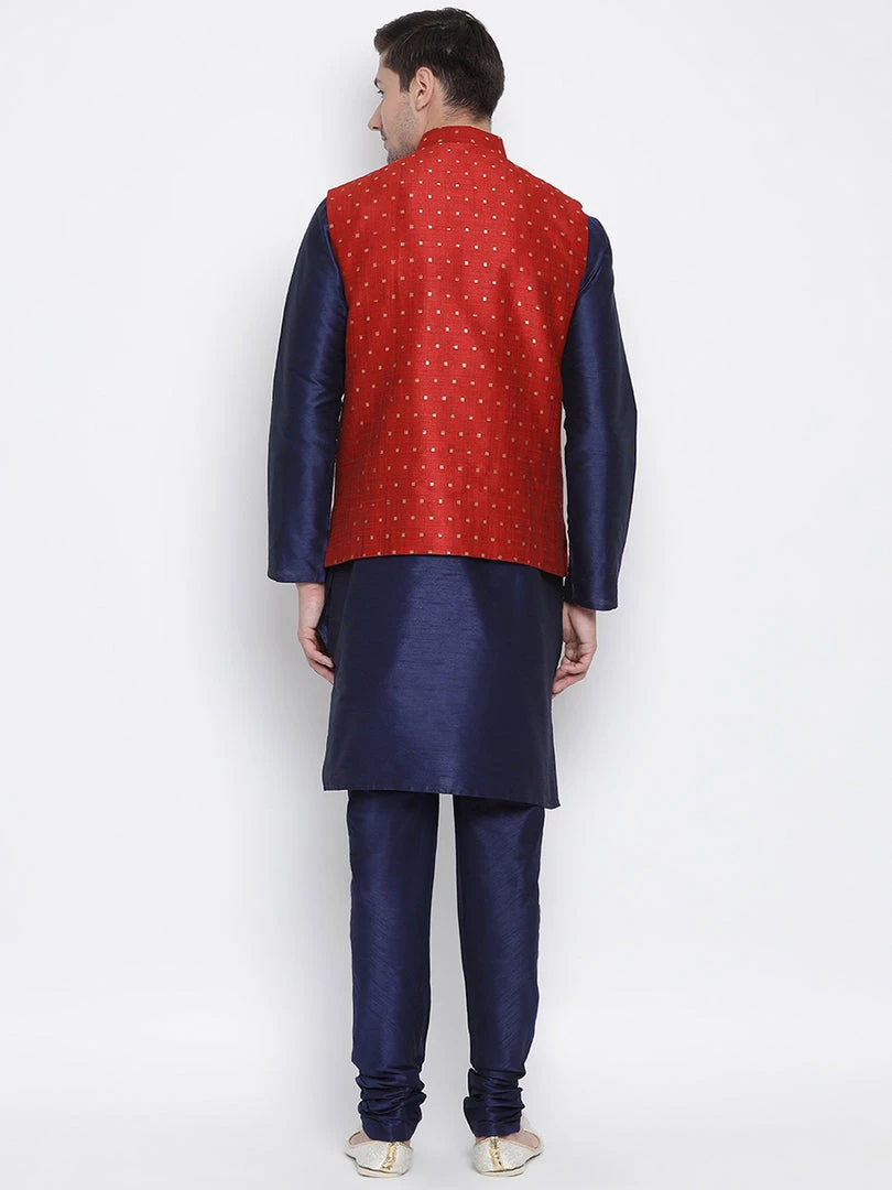 Dark blue solid kurta with solid churidar and maroon Nehru jacket