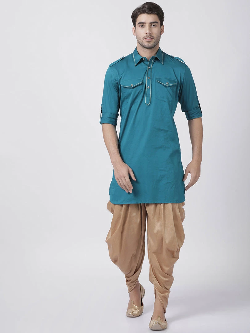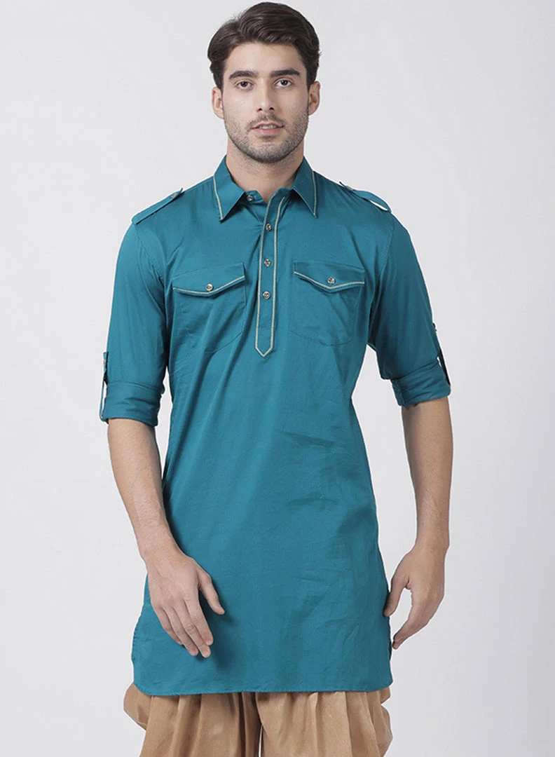 Turquoise straight above knee length pathani kurta, has a shirt collar, long sleeves, button placket, curved hem, two pockets and side slits