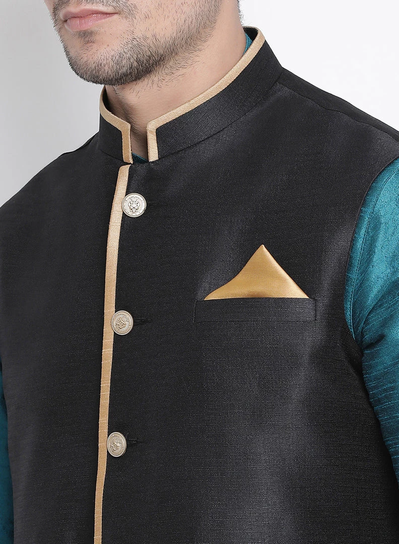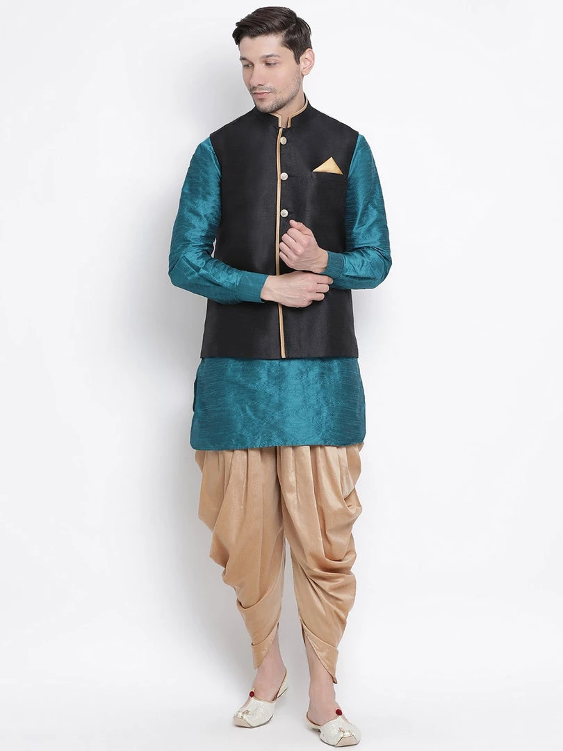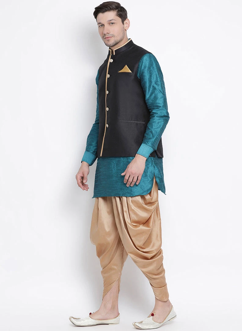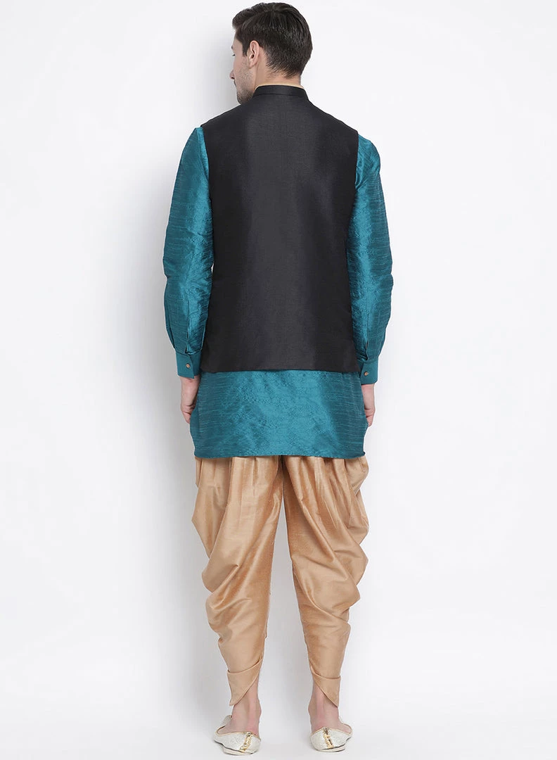 Dark green solid kurta with solid dhoti pant and black Nehru jacket