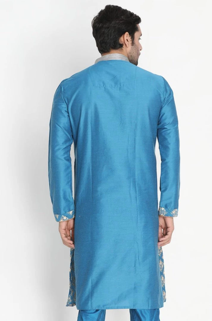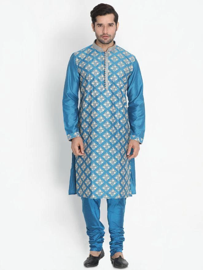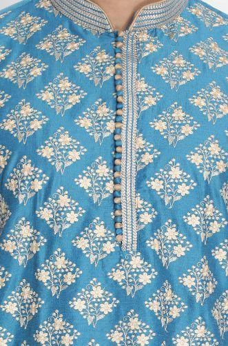 Turquoise blue and cream color embroidered straight knee length kurta, has a mandarin collar, button placket, long sleeves, straight hem