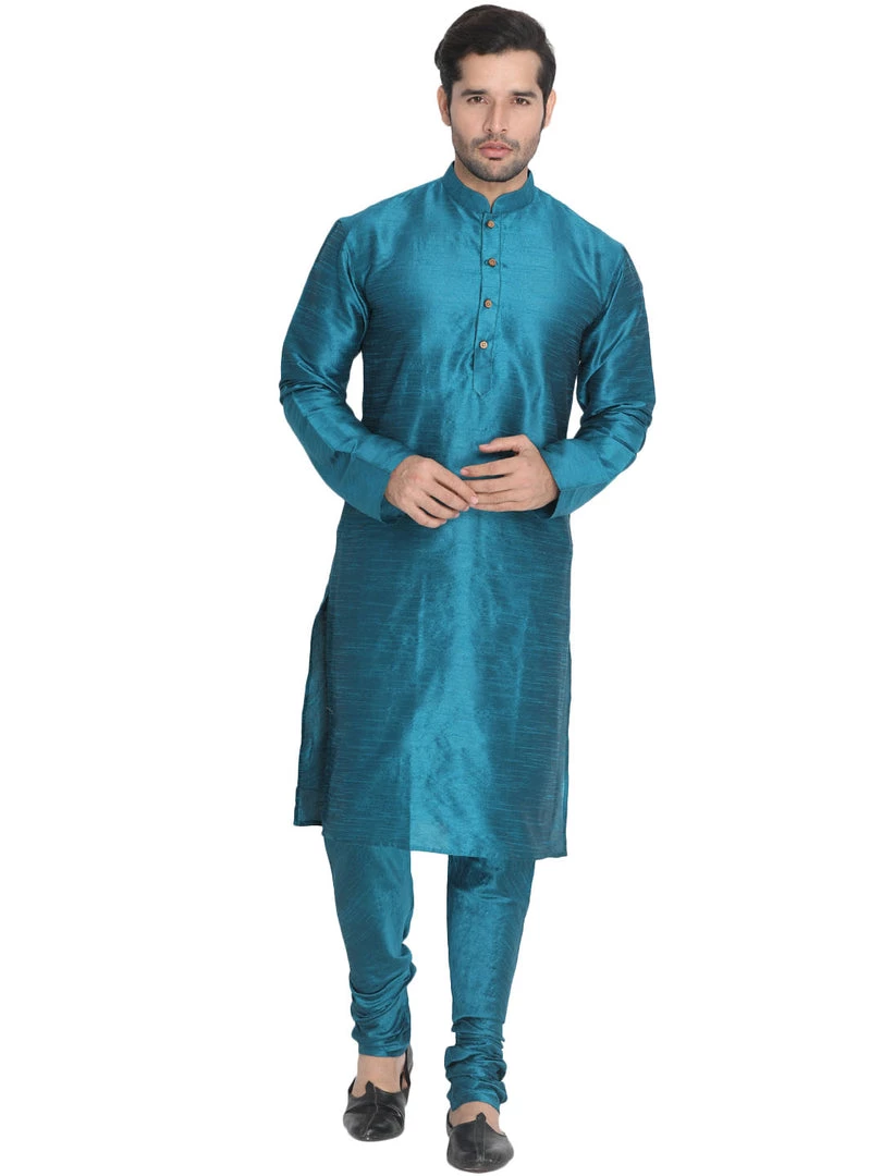 Turquoise solid straight knee length kurta, has a mandarin collar, button placket, long sleeves, straight hem