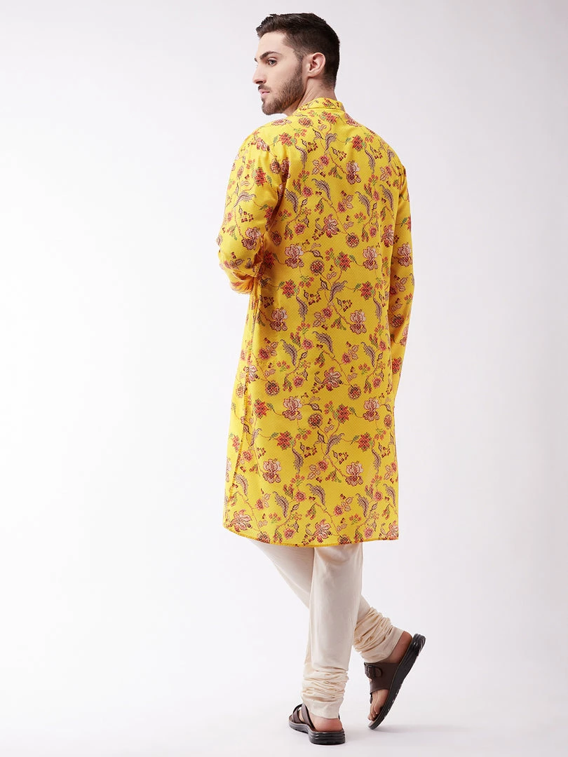 Men’s Digital Printed floral pattern straight kurta, has a mandarin collar, straight hem, and side slits and Gotta Border Detailing on Neck And sleeves With Viscose fluid Pyjama, has a drawstring closure.