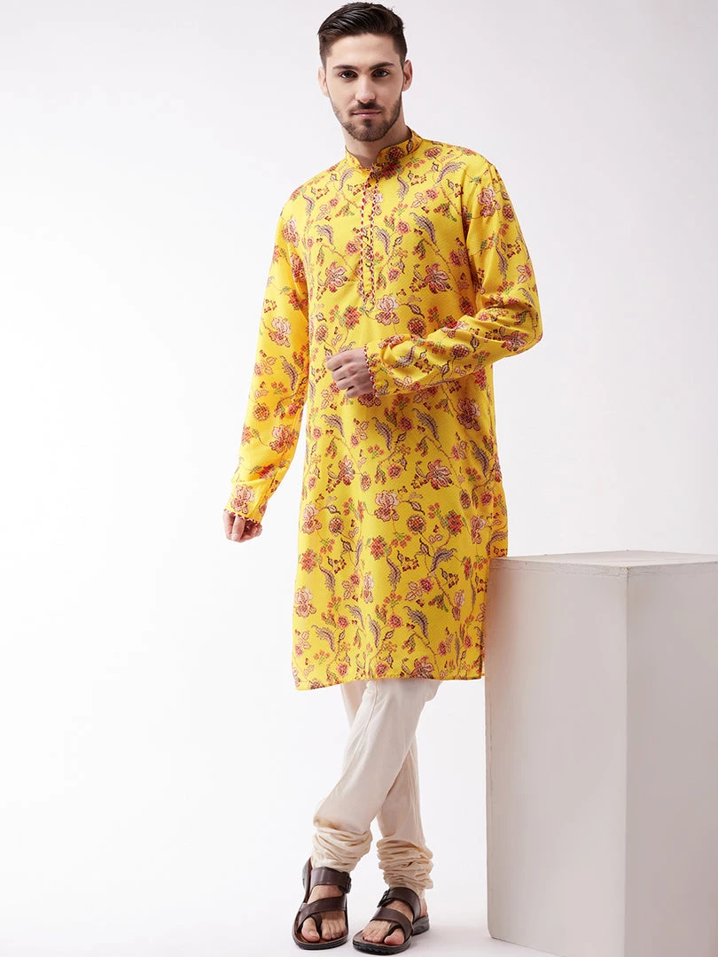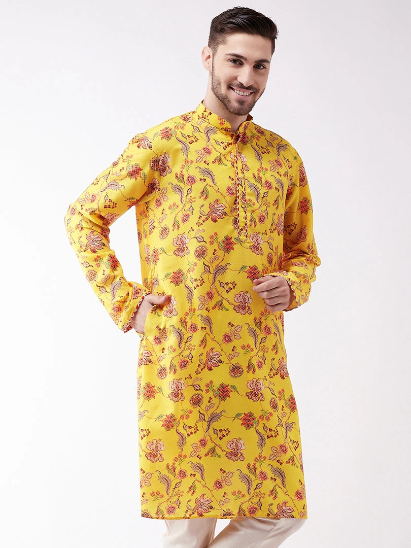 Men’s Digital Printed floral pattern straight kurta, has a mandarin collar, straight hem, and side slits and Gotta Border Detailing on Neck And sleeves