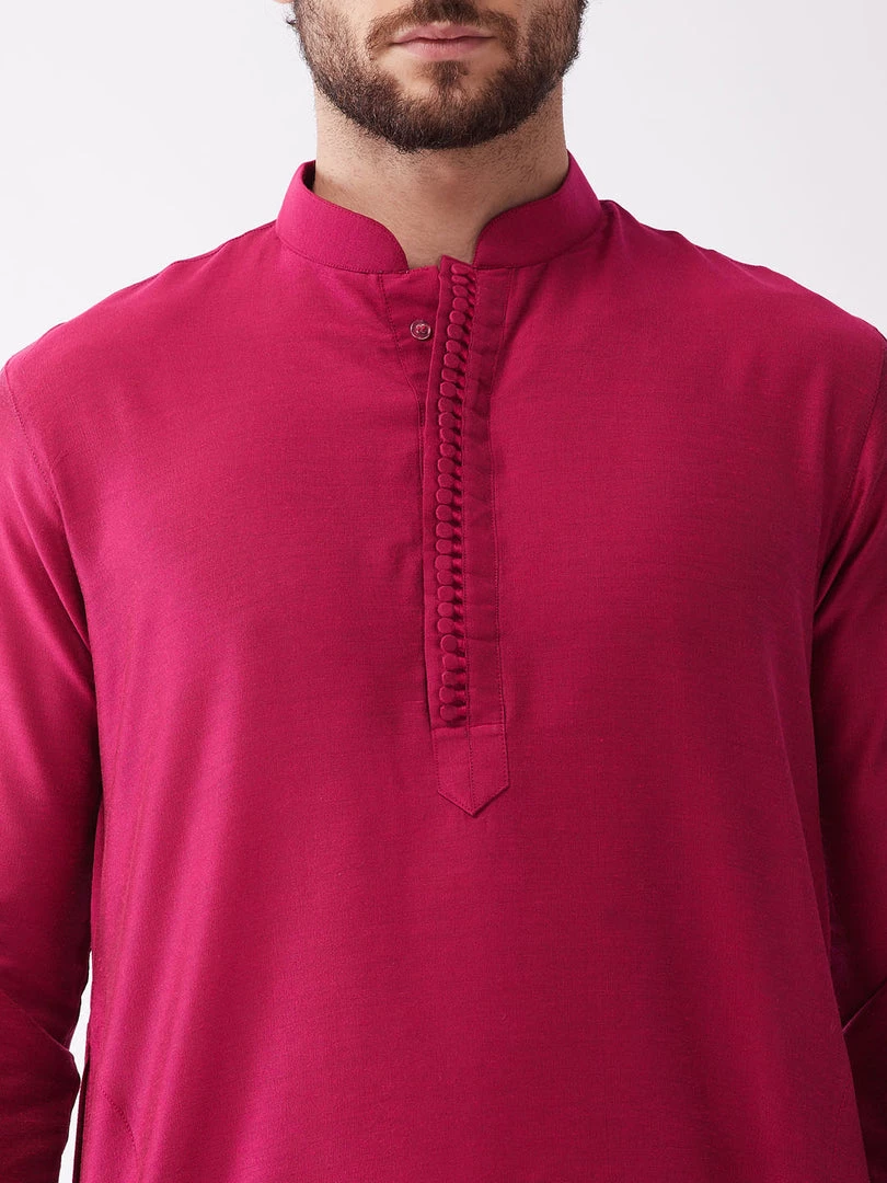 Fuchsia pink solid straight knee-length silk blend kurta, has a mandarin collar, long sleeves, button placket, straight hem