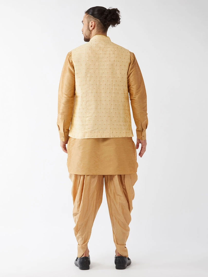 Rose Gold Solid kurta with dhoti pants and Gold colored woven Nehru jacket