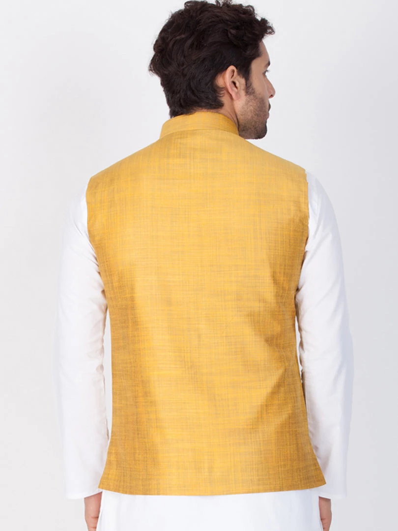 Yellow and gold toned woven Nehru jacket, has a mandarin collar, a full button placket, sleeveless, three pockets