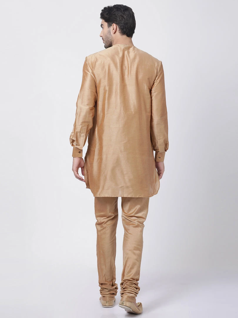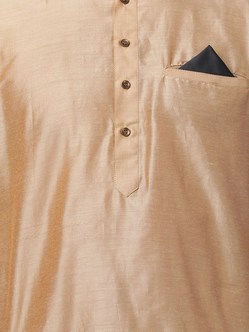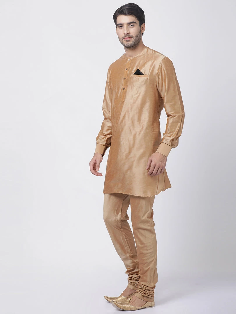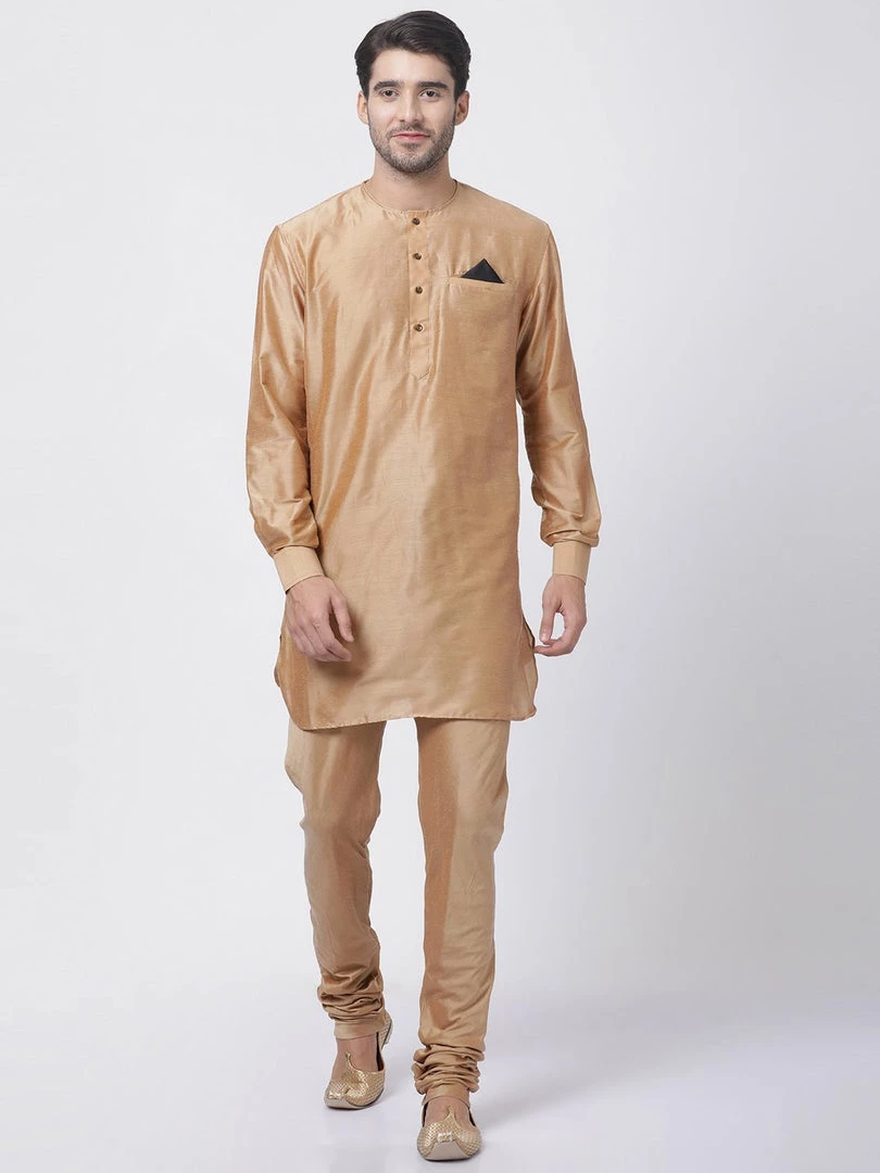 Gold solid straight cuff length kurta, has a Round Neck, button placket, long sleeves, Straight hem, Pocket with a pocket square.