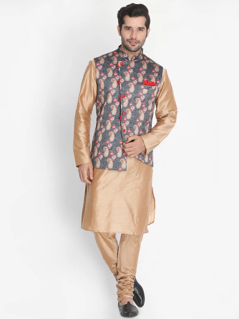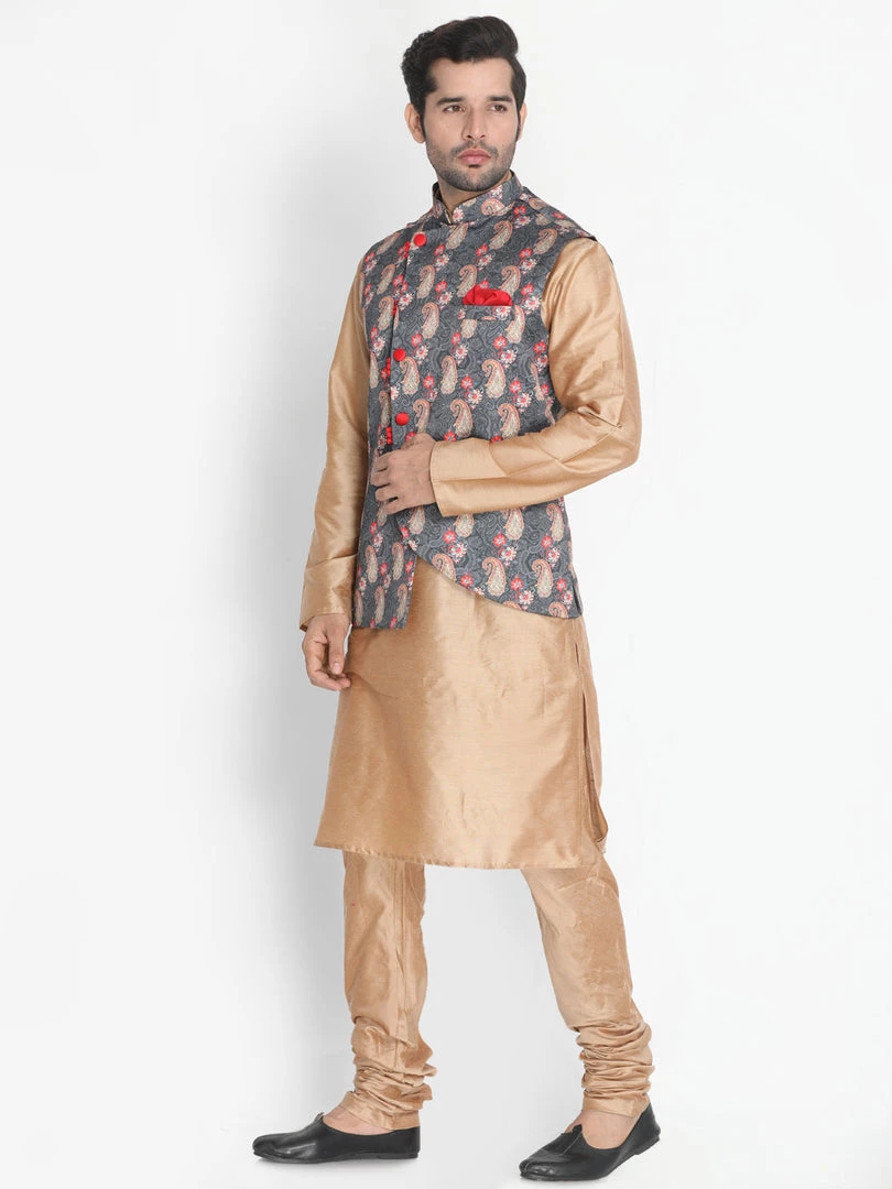 Gold toned solid kurta with solid churidar and grey Nehru jacket