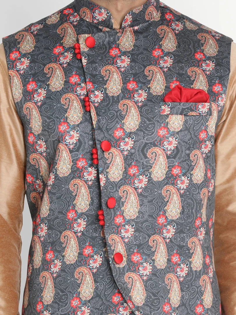 Grey printed Nehru jacket, has a mandarin collar, a side button placket, sleeveless, a welt pocket. Comes with pocket square