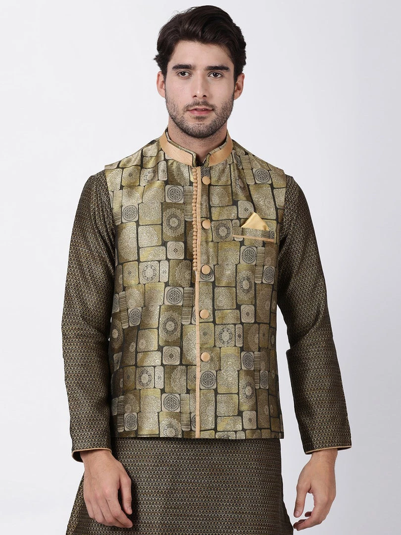 Green and gold toned woven Nehru jacket, has a mandarin collar, sleeveless, a full button placket, a pocket. Comes with pocket square.