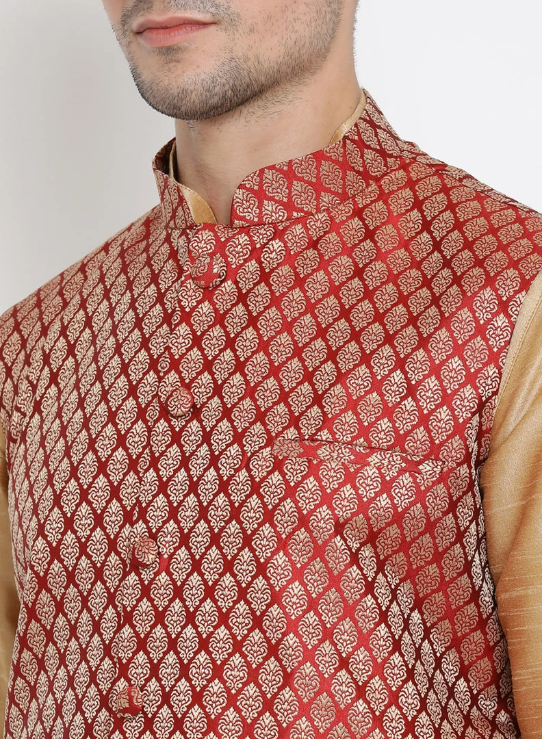 Maroon and gold toned self design woven Nehru jacket, has a mandarin collar, sleeveless, three pockets
