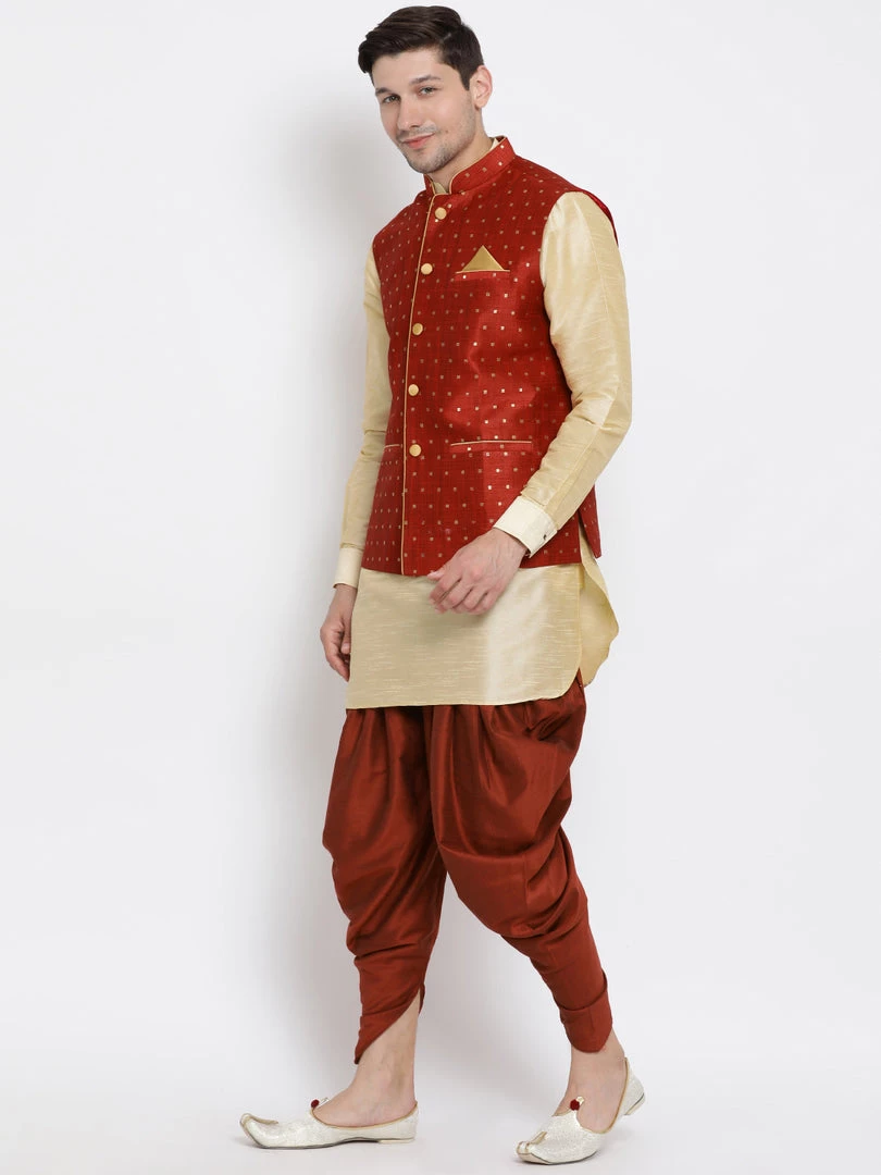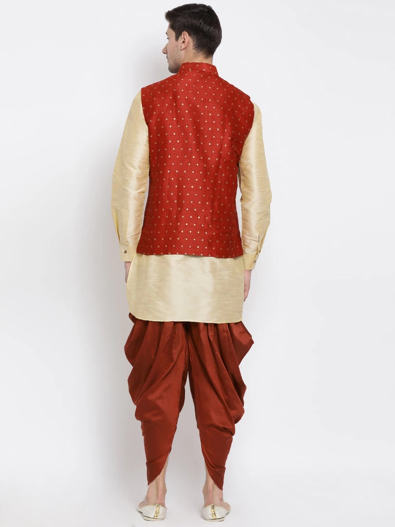Gold toned solid kurta with solid dhoti pant and maroon Nehru jacket