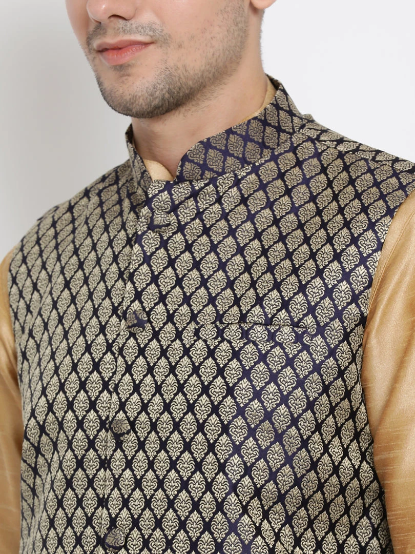 Blue and beige self design woven Nehru jacket, has a mandarin collar, sleeveless, three pockets