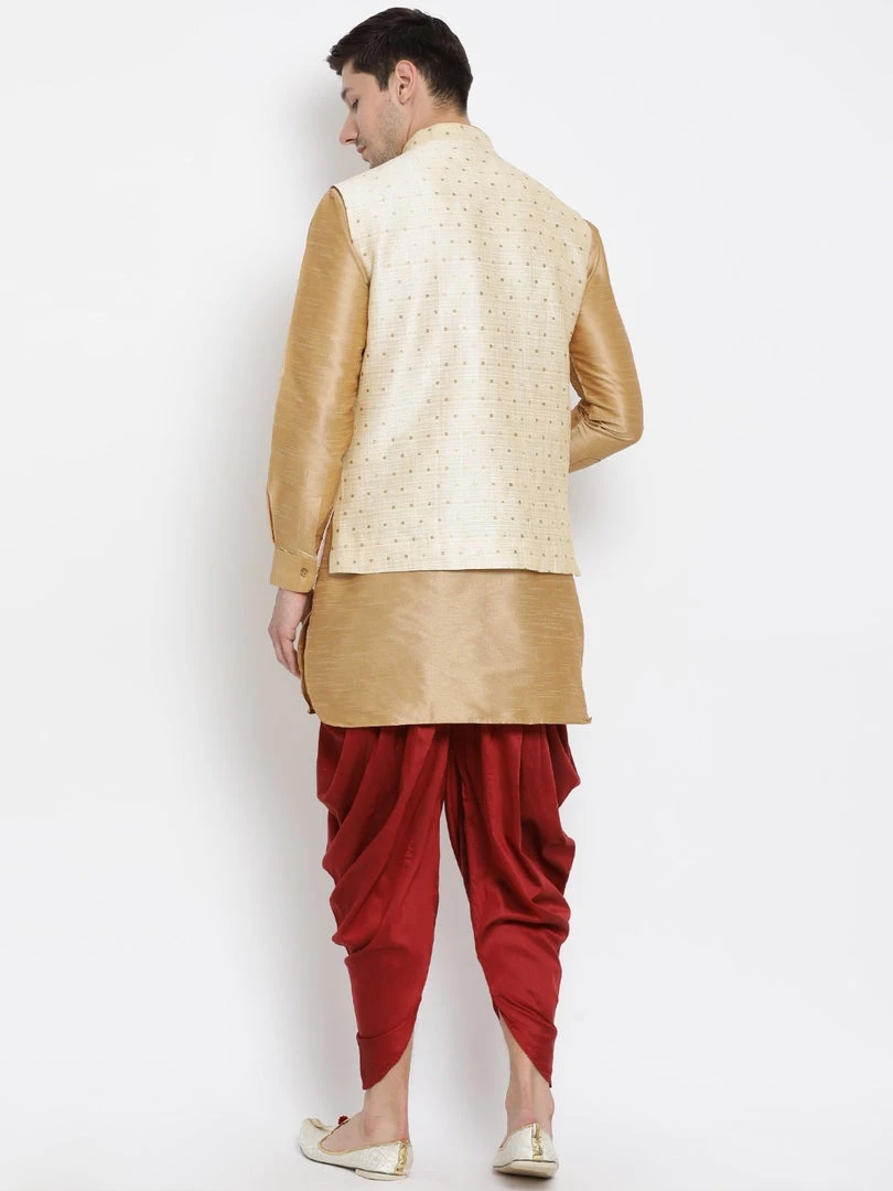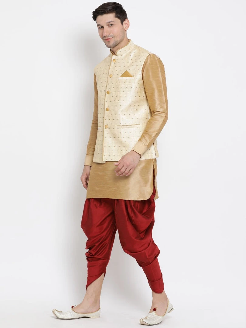 Gold toned solid kurta with solid dhoti pant and golden Nehru jacket