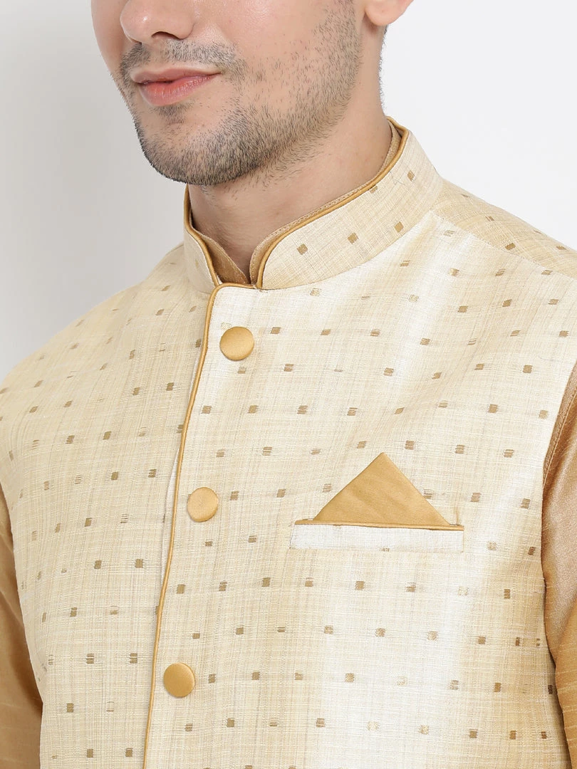 Golden and beige woven Nehru jacket, has a mandarin collar, sleeveless, three pockets