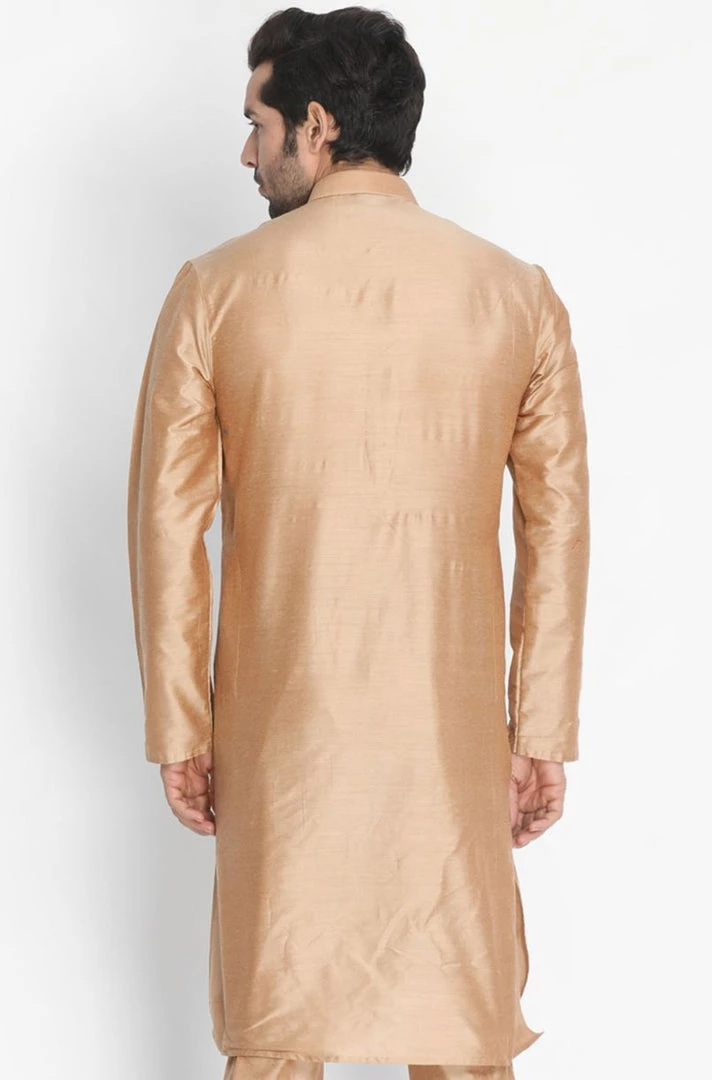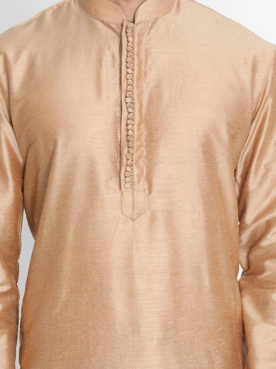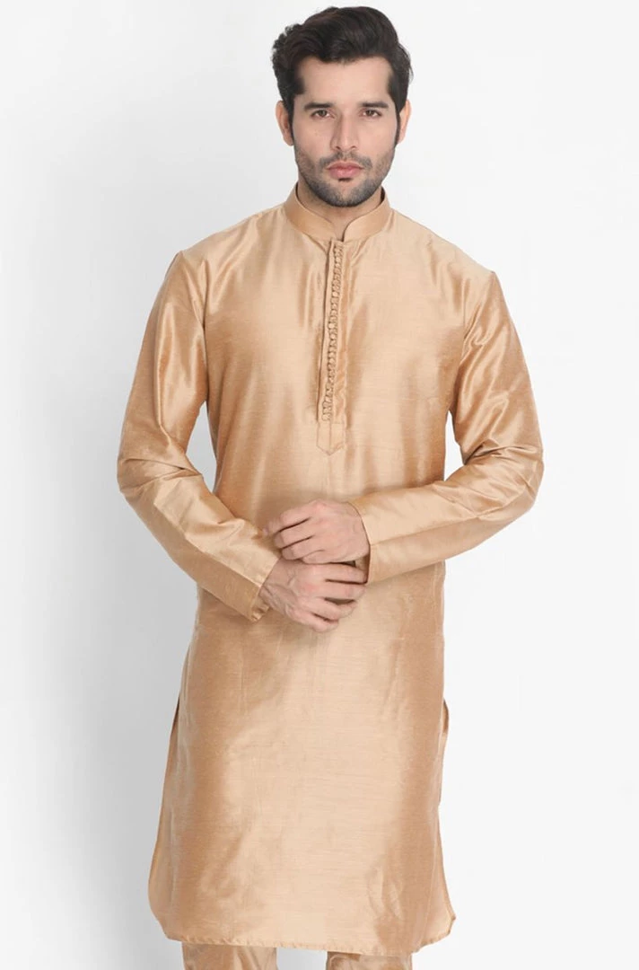 Gold Solid straight Knee length kurta, has a Mandarin Collar, button placket, long sleeves, Curved hem, Side slits.Â