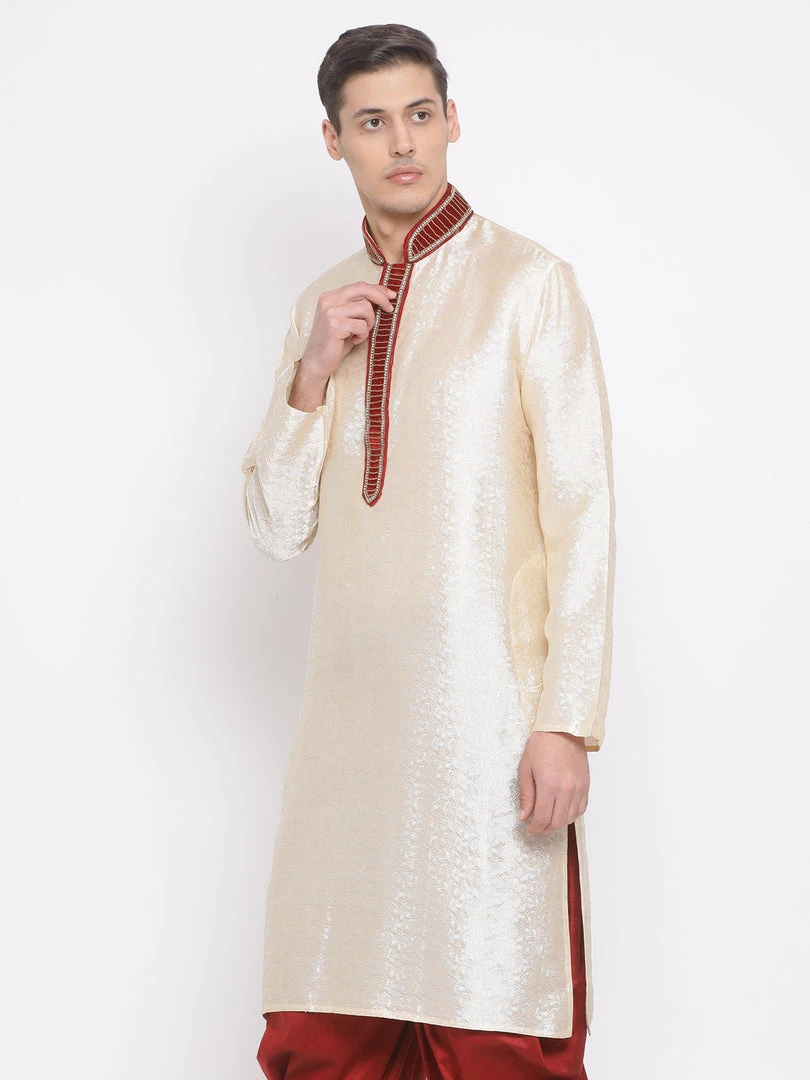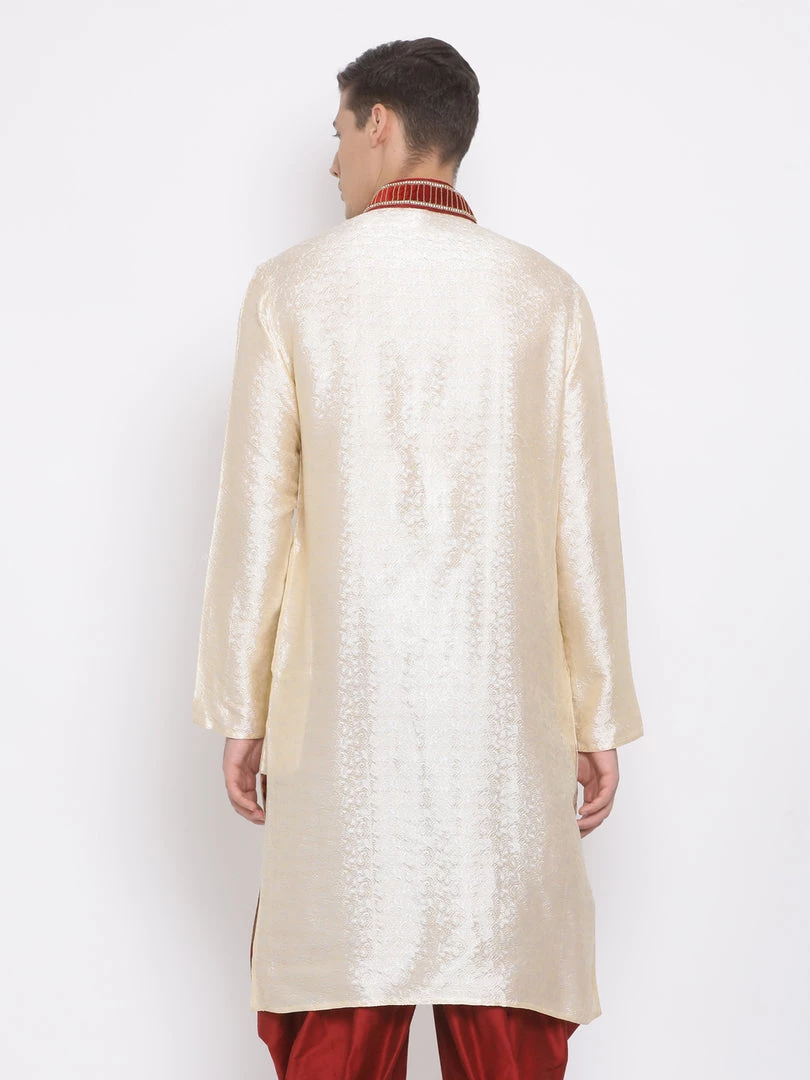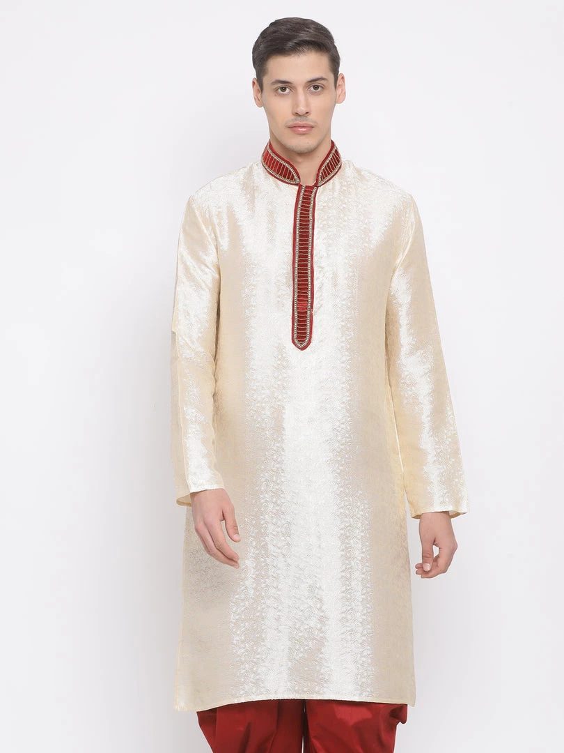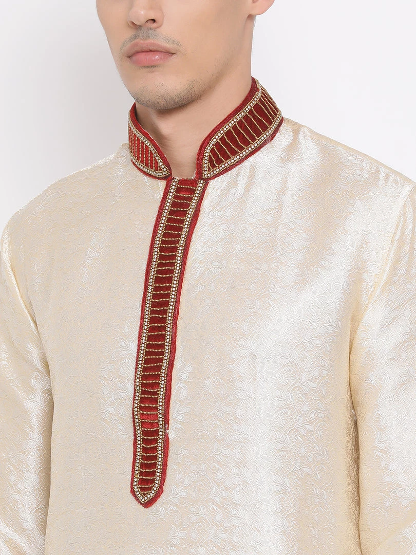 Gold woven straight kurta, has a mandarin collar, long sleeves, straight hem, embellished detailing around collar and placket, and side slits