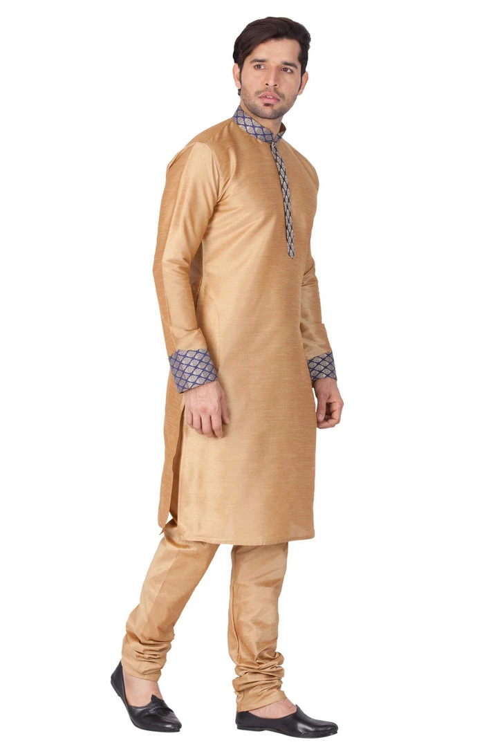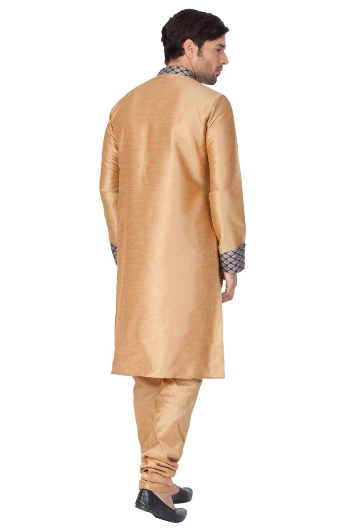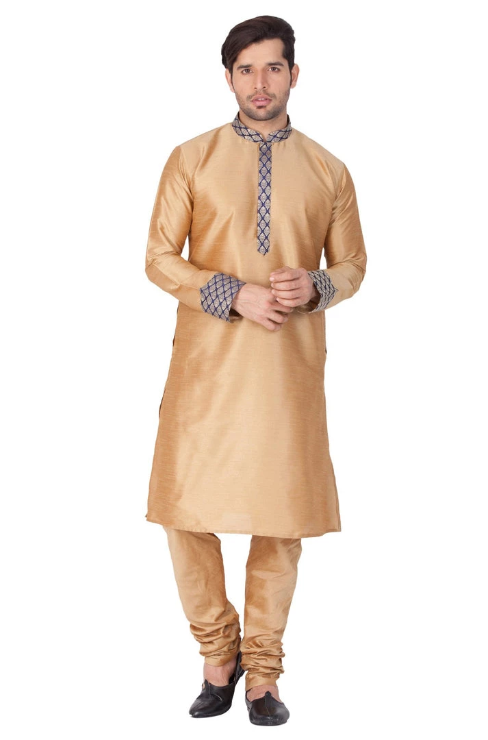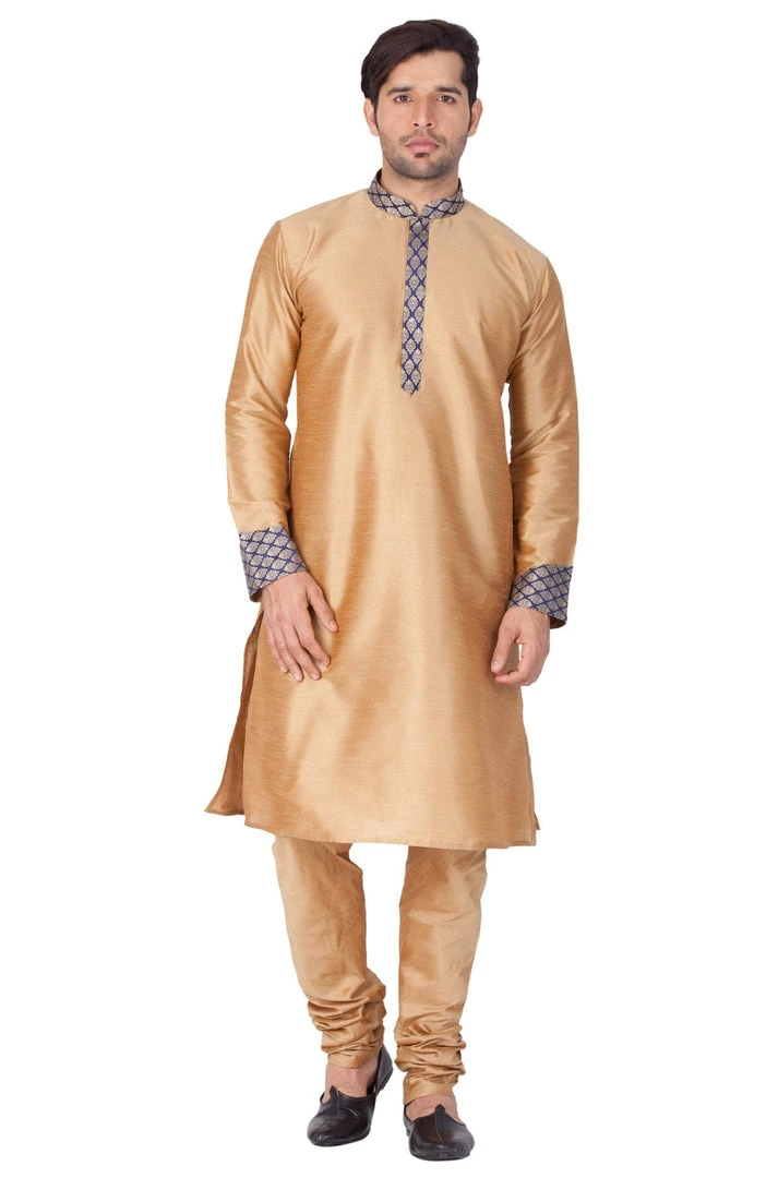 Gold toned solid yoke design straight knee length kurta, has a mandarin collar, button placket, long sleeves, straight hem. Blue and off white border on sleeves and collar.