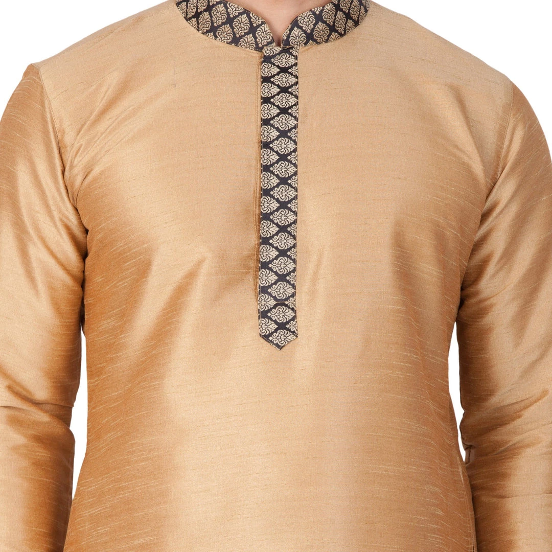 Gold toned solid yoke design straight knee length kurta, has a mandarin collar, invisible button placket, long sleeves, straight hem. Black and off white border on sleeves and collar.