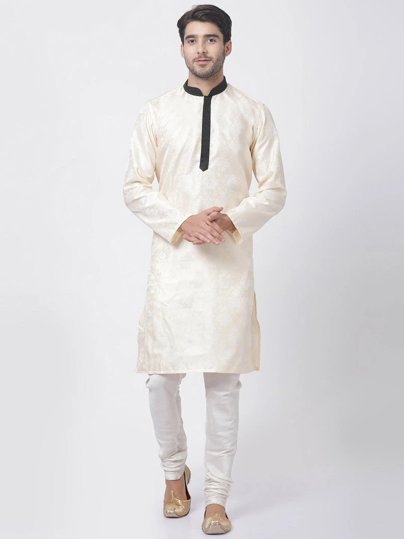 Beige and white woven straight above knee length kurta, has a black color mandarin collar and button placket, long sleeves, straight hem.