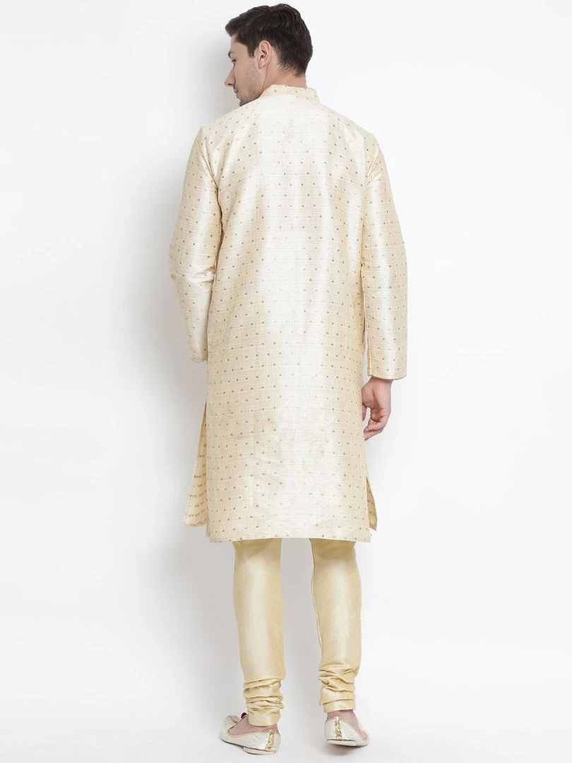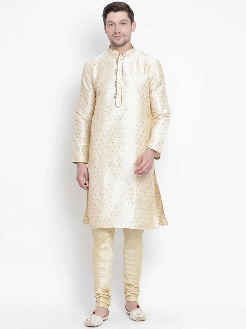 Beige and golden woven straight knee length kurta, has a mandarin collar, long sleeves, button placket, straight hem