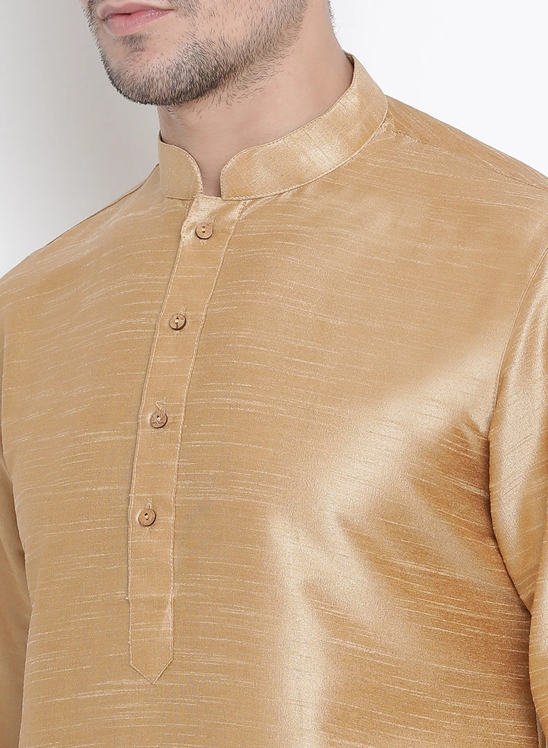 Golden solid straight knee length kurta, has a mandarin collar, button placket, long sleeves, straight hem