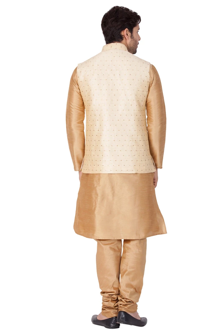 Rose gold solid kurta with solid churidar and gold Nehru jacket