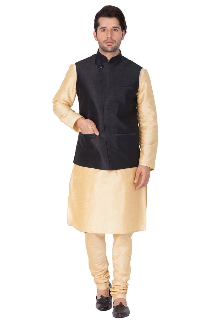 Gold toned solid kurta with solid churidar and black Nehru jacket