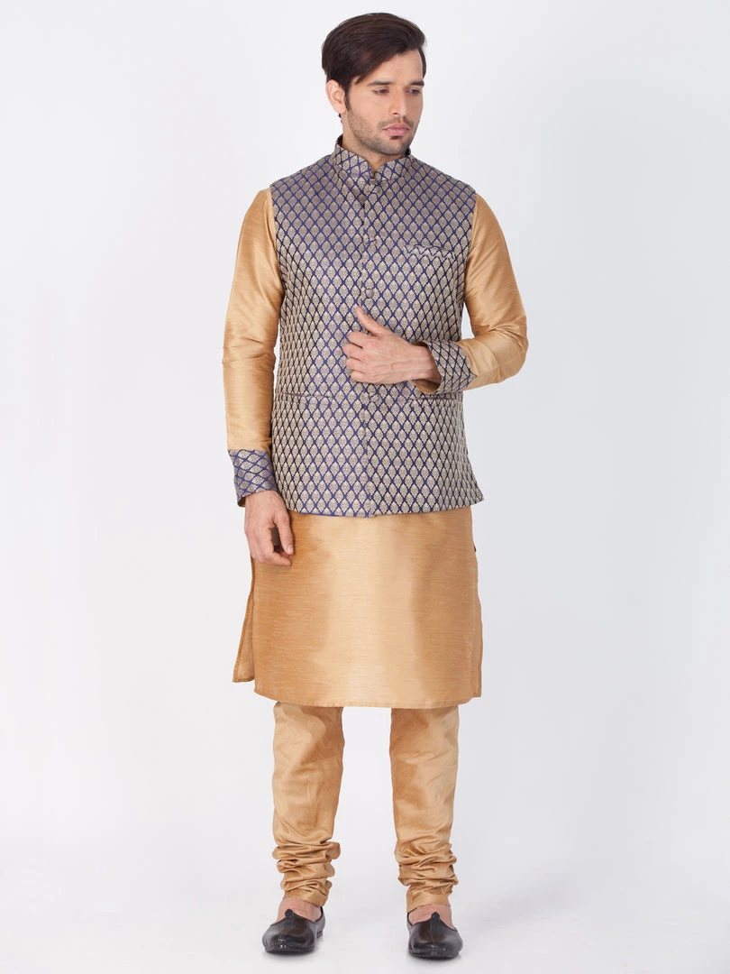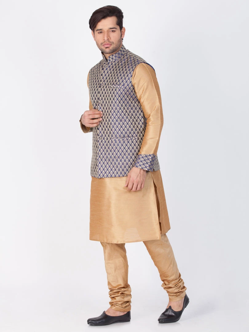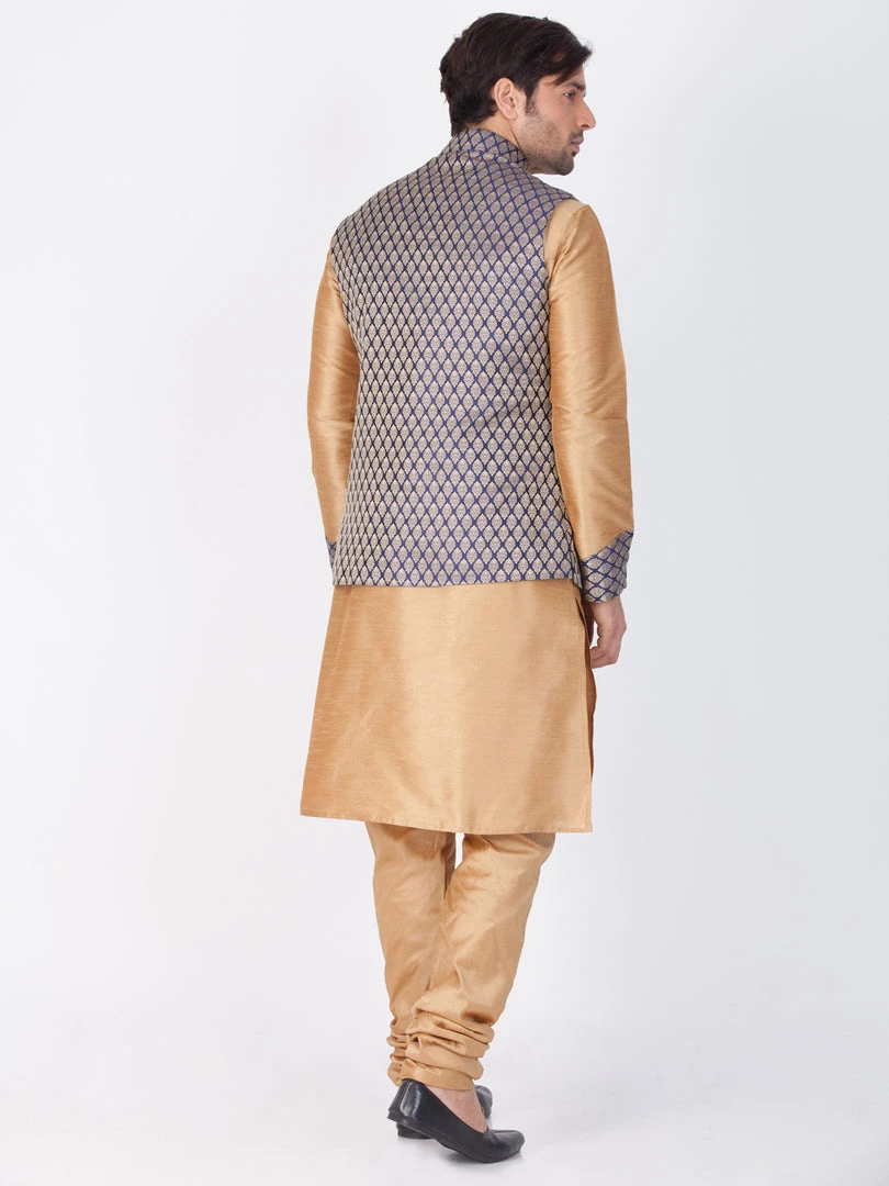 Gold toned solid kurta with solid churidar and blue Nehru jacket